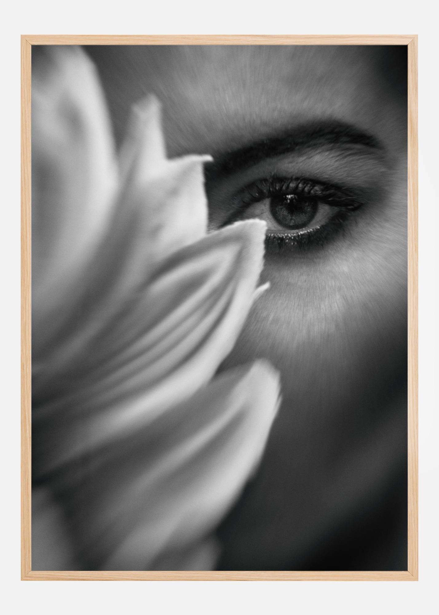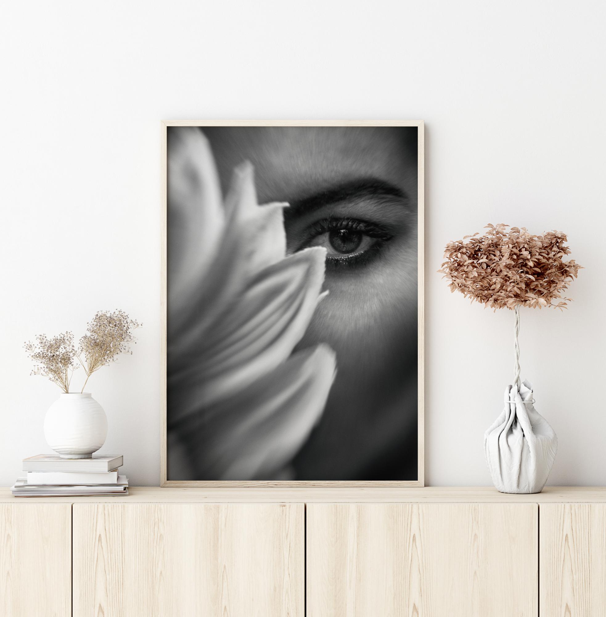 Ein atemberaubendes Poster mit einer Blume und dem Auge einer Frau in Großaufnahme. Die sanften Schwarz- und Weißtöne von allen anderen Farben ab. Verwandeln Sie jeden Raum in einen Ort des Friedens für die Seele.