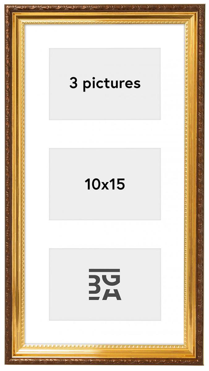 Dieser Collage-Bilderrahmen von Galleri1 ist bestens geeignet, deine Wand mit Fotos von Familie, Freunden, Fotos von tollen Erlebnissen oder besonderen Momenten zu schmücken. Der Bilderrahmen bietet Platz für 3 Bilder im Format 10x15 cm. Der goldfarbene Collagerahmen überzeugt durch seinen schönen Retrostil mit dekorativer Außenleiste in einer warm braunen Farbnuance. Der Collage-Bilderrahmen ist mit einer Wandhalterung versehen .