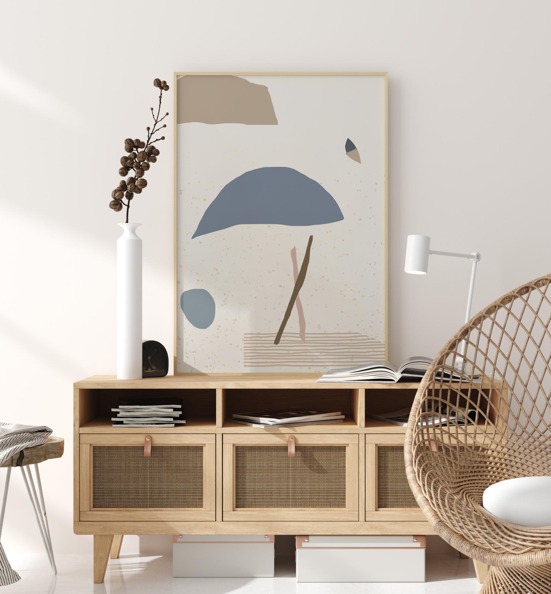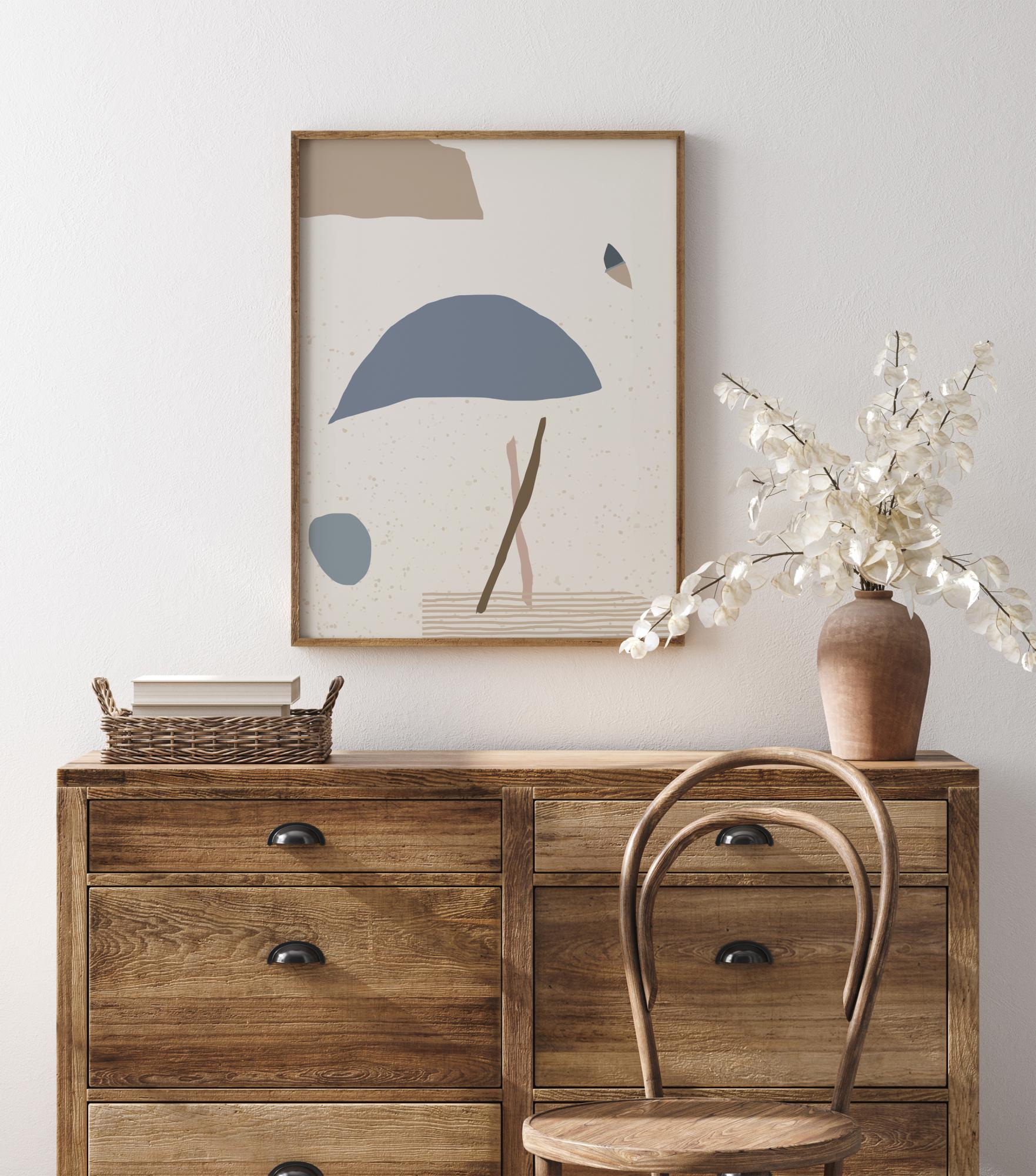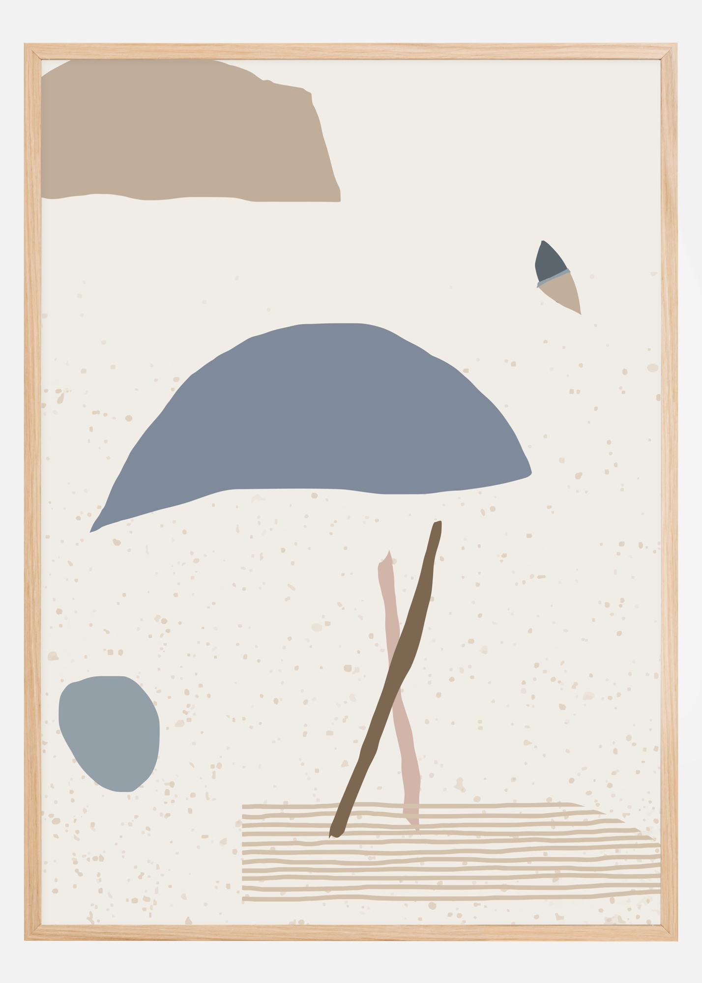 Ein abstraktes Poster mit blauen, braunen und grauen Formen auf weißem Hintergrund. Sehen Sie, was Sie sehen wollen in diesem minimalistischen Werk, das das Gefühl einer Person, eines Regenschirms, eines Balls, eines Schmetterlings und einer Wolke vermittelt. Holen Sie sich mit diesem kontemplativen Kunstposter die Galerie nach Hause und diskutieren Sie seine Bedeutung.