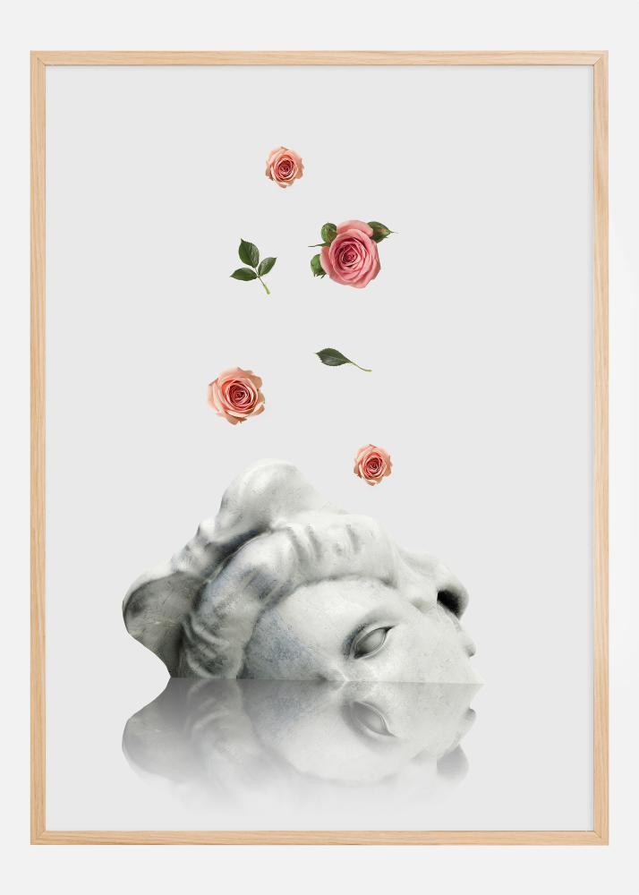 Diese künstlerische Poster zeigt eine traumhafte Komposition, bei der eine Skulptur eines Gesichts, das zu versinken oder sich aufzulösen scheint, von wirbelnden Rosen in verschiedenen Blühstadien und Laub umgeben ist. Es ist ein fesselndes Bild, das die Schönheit von Stein und Flora vereint und ein Gefühl von sowohl Zeitlosigkeit als auch Vergänglichkeit bietet.