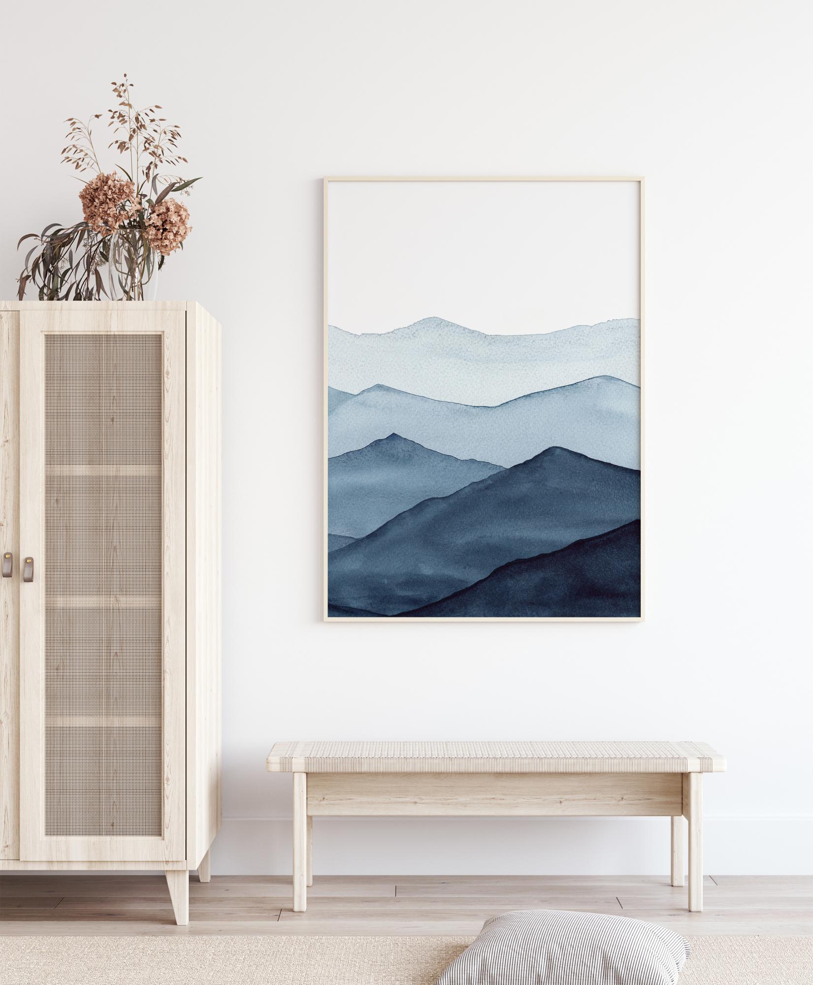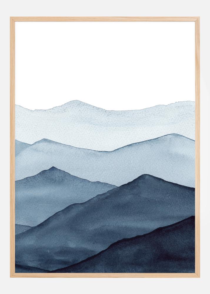 Ein atemberaubendes, minimalistisches Poster einer Kette von blauen Bergen. Der nächstgelegene Berg ist in einem dunklen Blauton gehalten, wobei die Farben in der Ferne immer mehr verwaschen. Die sanften Blautöne sind perfekt, um eine kühle, aber beruhigende Stimmung zu erzeugen, während man in die Ferne blickt.