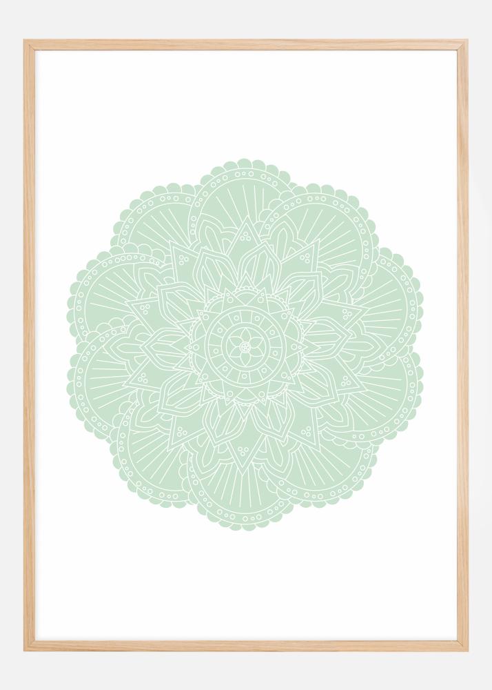 Dieses Poster zeigt eine symmetrische Mandala in entspannenden Grüntönen, ein Bild, das sowohl visuell ansprechend als auch symbolisch reich ist. Die Mandala, bekannt für ihre Verwendung in Meditation und Entspannung, bietet ein komplexes Muster, das das Auge einlädt zu erkunden und den Geist wandern lässt. Die sanften Töne tragen zu einem Gefühl von Balance und Harmonie bei, was dieses Kunstwerk zu einem perfekten Rahmen für Kontemplation und Ruhe macht.