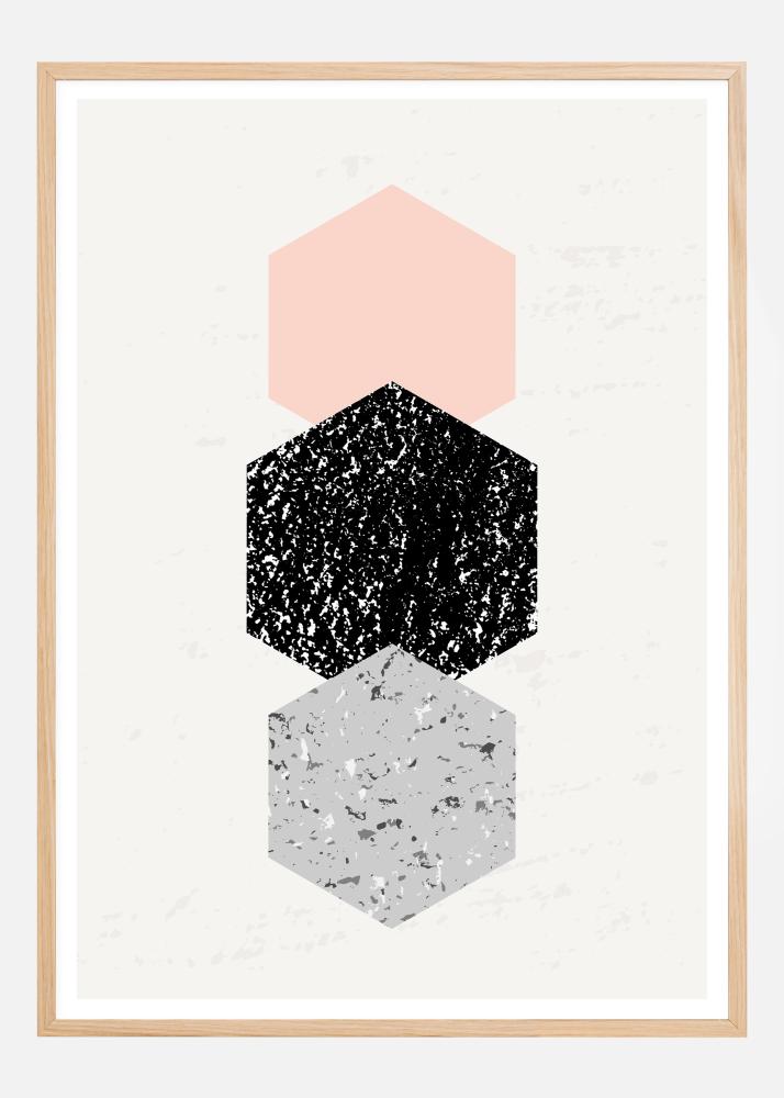 Ein abstraktes Sechseck-Poster mit drei übereinanderliegenden Sechsecken. Das obere ist ein zartes Rosa, das größere mittlere ist eine schwarz-weiß gesprenkelte Form, und das untere ist ein blaues, kieselgestrichenes Sechseck. Das Auge folgt diesem Stück ohne Ablenkung - perfekt für ein Büro zuhause.