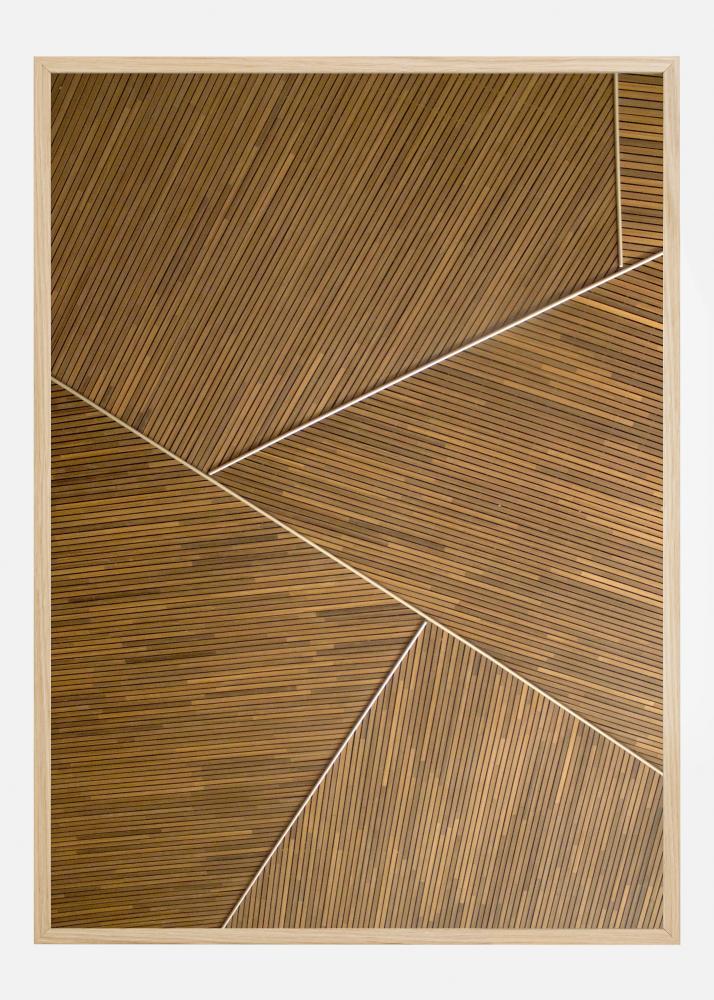Ein Holzmusterposter mit abstrakten geometrischen Formen. Bei diesem einfachen Muster greifen Holzbretter ineinander. Die Winkel der Bretter führen das Auge um das Stück herum, wobei die weißen Linien hervorragende Fokuspunkte bilden. Setzen Sie damit ein Zeichen an einer einfachen neutralen oder weißen Wand in Ihrem Zuhause.
