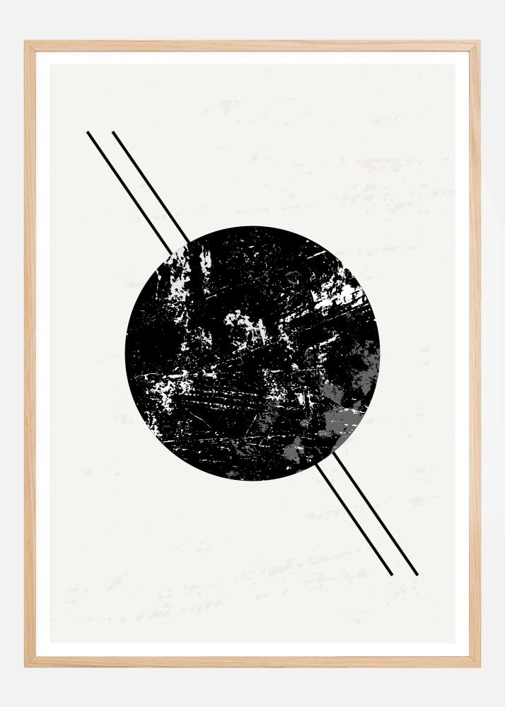 Ein starkes abstraktes Poster mit einem schwarzen Kreis und zwei Linien, die von links oben nach rechts unten verlaufen. Der schwarze Kreis hat einen weißen und grauen Marmoreffekt, die beiden schwarzen Linien ähneln fast den Ringen des Saturns. Holen Sie sich dieses Poster nach Hause und sehen Sie sich die vielen Möglichkeiten an, die in diesem zum Nachdenken anregenden Werk stecken.