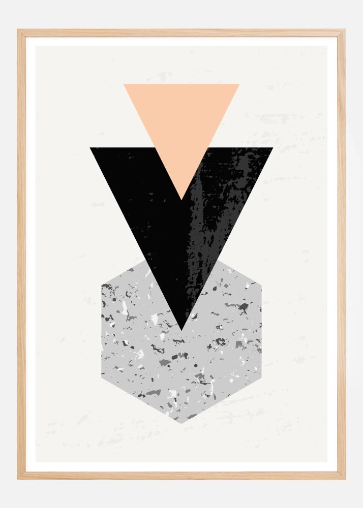 Ein dreieckiges geometrisches Poster mit leuchtenden, kräftigen Formen. Die beiden Dreiecke in Rosa und Schwarz weisen den Weg nach unten und lenken das Auge auf das sanftere Blau und den gestrichelten Würfel. Das zentrale schwarze Dreieck steht im Mittelpunkt und macht dieses Poster zu einem perfekten Stück für das Büro zu hause, da es mit seinem weniger ablenkenden Design in jeden Raum passt.