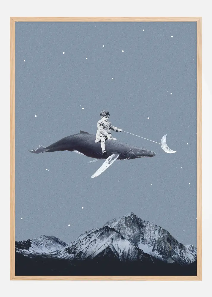 Dieses kreative und inspirierende Poster zeigt einen jungen Entdecker, der auf einem Wal reitend den Mond an einem Stock einfängt. Es symbolisiert das Streben und den Traum, das Unmögliche zu erreichen. Der sternenklare Himmel und die robuste Gebirgslandschaft darunter verleihen ein Gefühl von Abenteuer und Erkundung des großen Unbekannten.