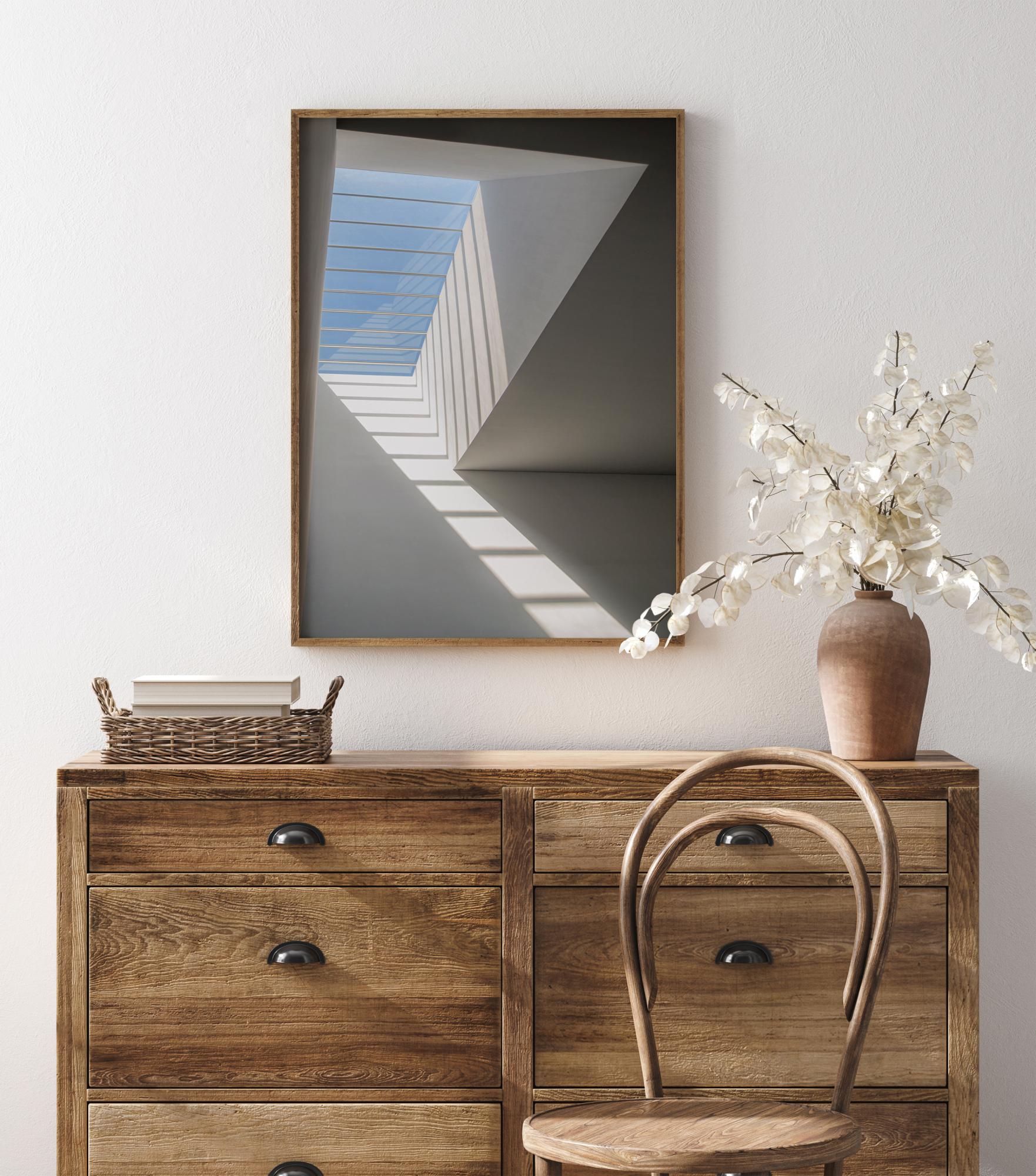 Ein einfaches, luftiges Poster eines hellen, weißen Innenraums. Auf der linken Seite befindet sich eine Dachgaube, durch die der blaue Himmel zu sehen ist. Das einfallende Licht wirft Schatten, die wie eine Leiter aussehen. Diese führen das Auge hinauf zu dem Licht im Freien. Bringen Sie mit diesem friedlichen Bild Helligkeit in einen dunklen Raum.
