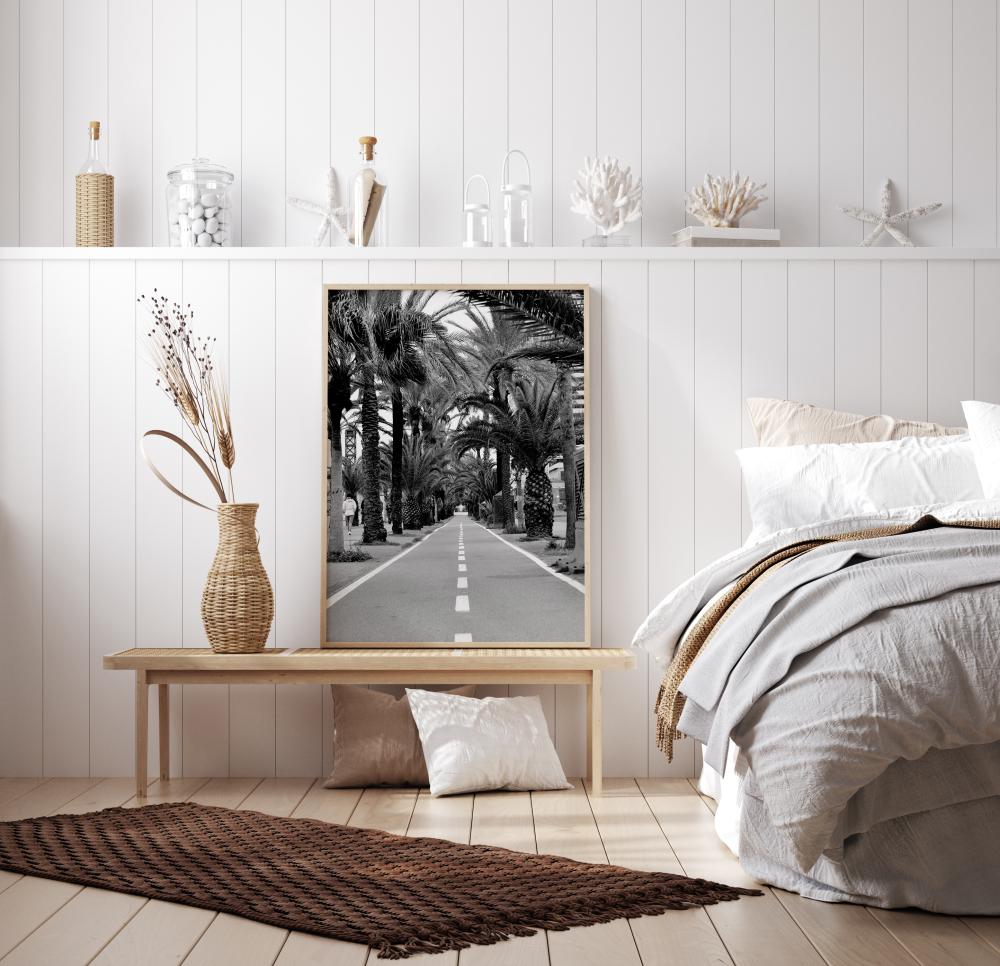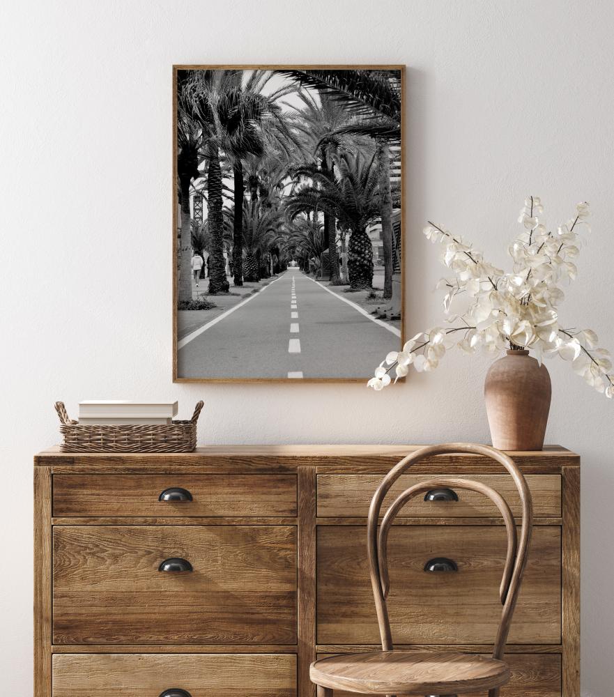 Ein Landschaftsposter mit einem Straßenabschnitt, der durch einen Palmenhain führt. Die Palmen begrenzen die Straße, während die weißen Linien in die Ferne führen. Die Bäume bilden einen Bogen, der Ihren Blick lenkt. Bringen Sie diese schwarz-weiße Schönheit an Ihre Wand, um eine exotische Atmosphäre zu schaffen.