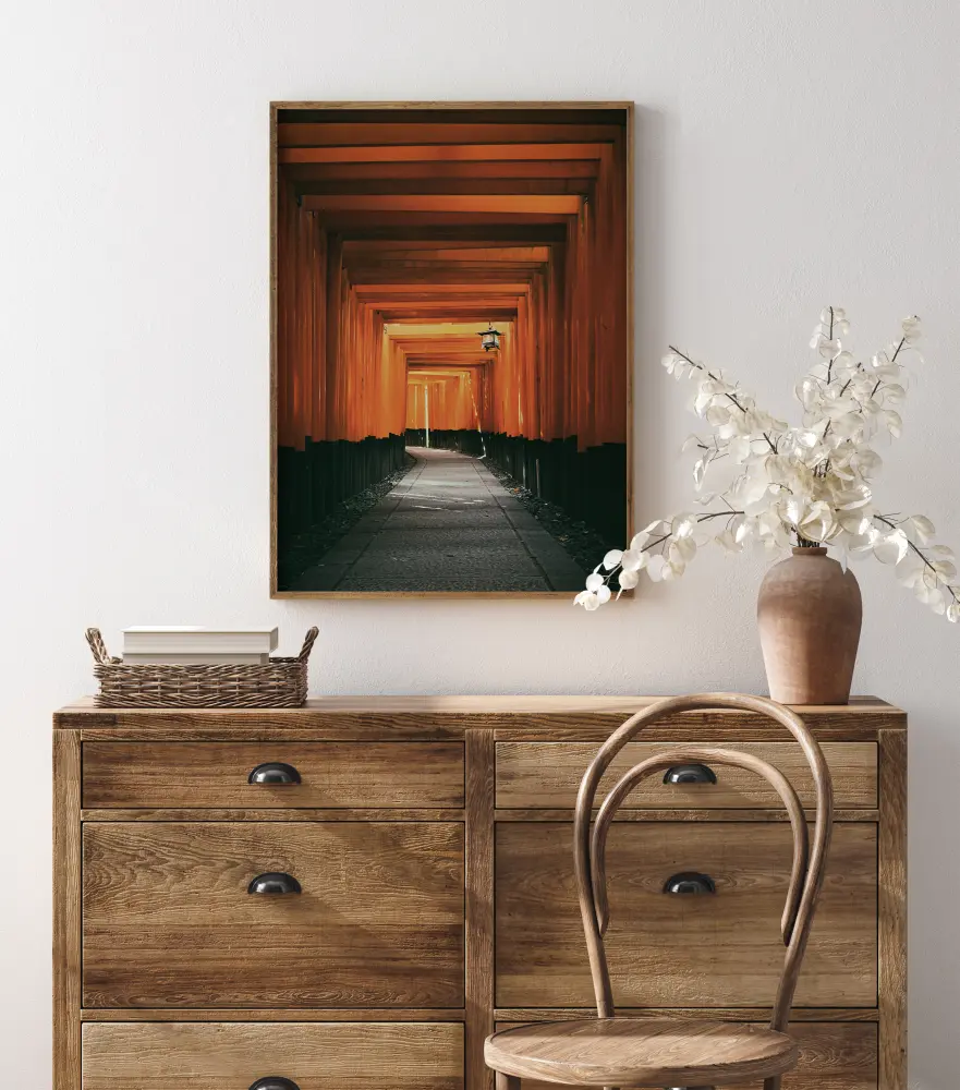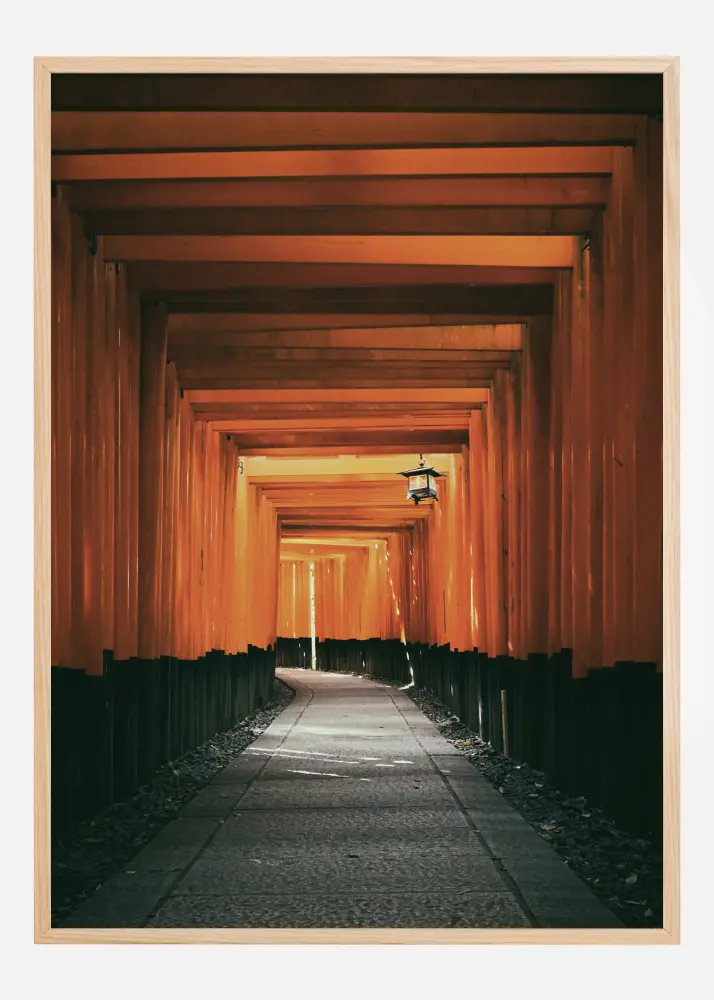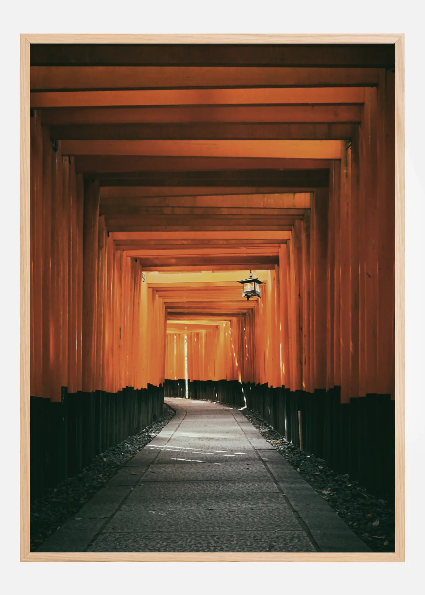 Ein braunes geomatrisches Poster, das einen Weg durch einen abstrakten Tunnel zeigt. Die dunkelgrauen Steine auf dem Weg passen zu den warmen Tönen des Holzdachs, das sich in der Ferne aufhellt. Lichtspalten dringen durch die Holzplanken und eine Laterne beleuchtet den Weg. Hängen Sie es auf, um eine ruhige Atmosphäre zu schaffen.