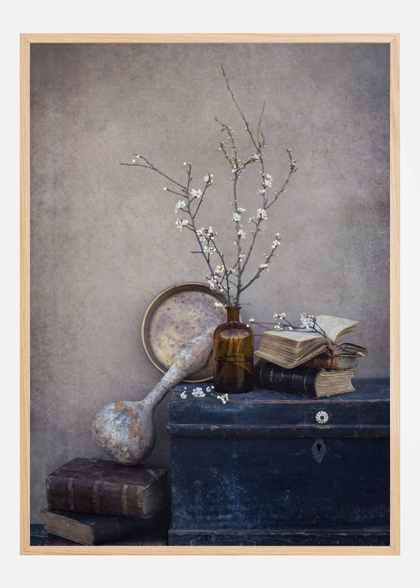 Ein Stillleben-Poster mit einer blauen Truhe, einer Vase, einem Teller, alten Büchern und Frühblühern. Das Stillleben ist vor einem einfachen grauen Hintergrund platziert, der die blaue Truhe zur Geltung bringt. Für ein rustikales Ambiente können Sie dieses Poster an einer neutralen Wand anbringen und sich an den Frühlingsblüten auf den nackten Zweigen erfreuen.
