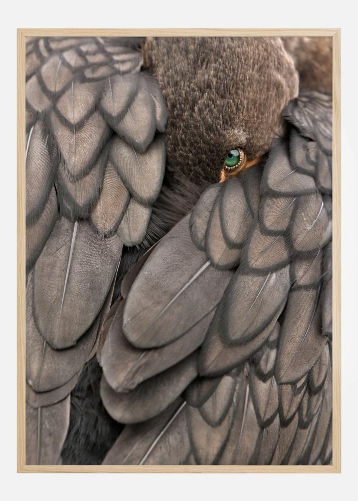 Dieses fesselnde Poster fängt den Moment der Intimität in der Natur durch die Nahaufnahme eines Vogels ein, wobei sein leuchtend grünes Auge wie ein Smaragd in den grauen Schattierungen der Federn leuchtet. Jede Feder ist mit Präzision skulptiert, was ein Gefühl für die elegante Form und Struktur des Vogels hervorruft. Es ist ein Werk, das sowohl Vogel-Liebhaber als auch Künstler anspricht, und jene, die die subtile Schönheit der Natur schätzen.