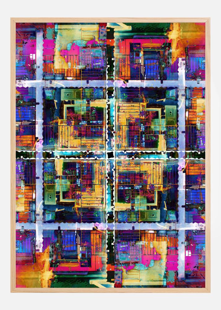 Ein Neonposter voller abstrakter Muster. Ein Regenbogen von Farben wie ein Ölteppich füllt dieses Bild, das wie ein Querschnitt durch ein Zimmer aussieht. Jedes Quadrat ist mit einem Rausch an Farben gefüllt, der dieses Bild zu einem faszinierenden Objekt macht, das man stundenlang betrachten kann - am besten in Kombination mit einer neutralen Wand.