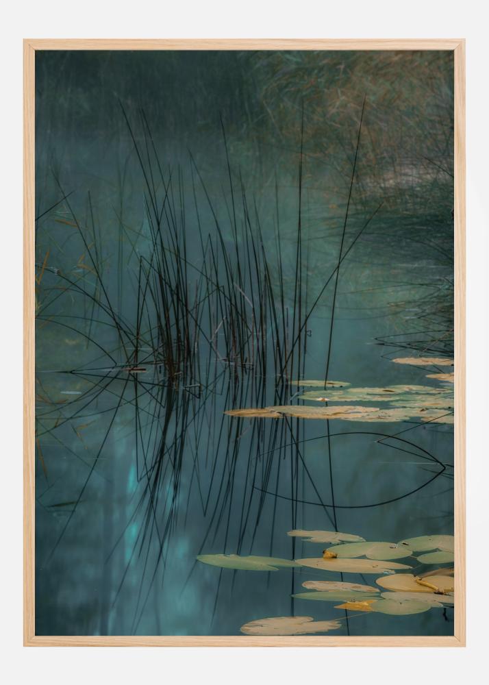 Ein Naturposter mit einer atemberaubenden aquablauen Öffnung, gefüllt mit Lilienblättern und Gedanken. Die sanften Farben verschmelzen zu einem wahrhaft heiteren Bild. Das stille Wasser schafft perfekte Reflexionen aus dem Schilf. Werden Sie eins mit der Natur, wenn Sie dieses Bild an Ihre Wand hängen und sich in der Ruhe verlieren.