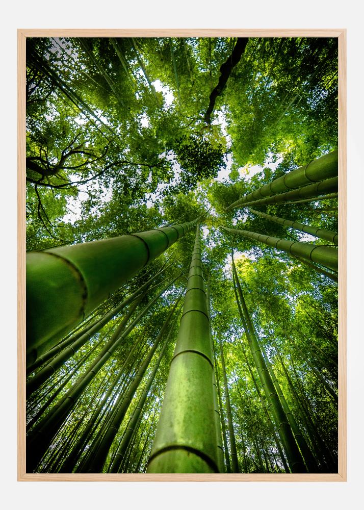 Ein Naturposter mit kräftigen grünen Bambuspflanzen. Schauen Sie hinauf in den Himmel, denn dieses Bild ist von dicken Bambusstämmen umgeben, die zu einem grünen Blätterdach in den Himmel führen. Stellen Sie sich vor, dass Sie in dieser ruhigen Dschungelwelt liegen, wenn Sie dieses Stück in Ihr Zuhause bringen.