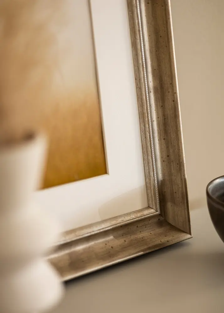Luxuriöser Rahmen in wahlfreier Größe mit einem klassischen Silberprofil. Ein breiter Silberrahmen passt zu fast allen Arten von Motiven und Umgebungen.