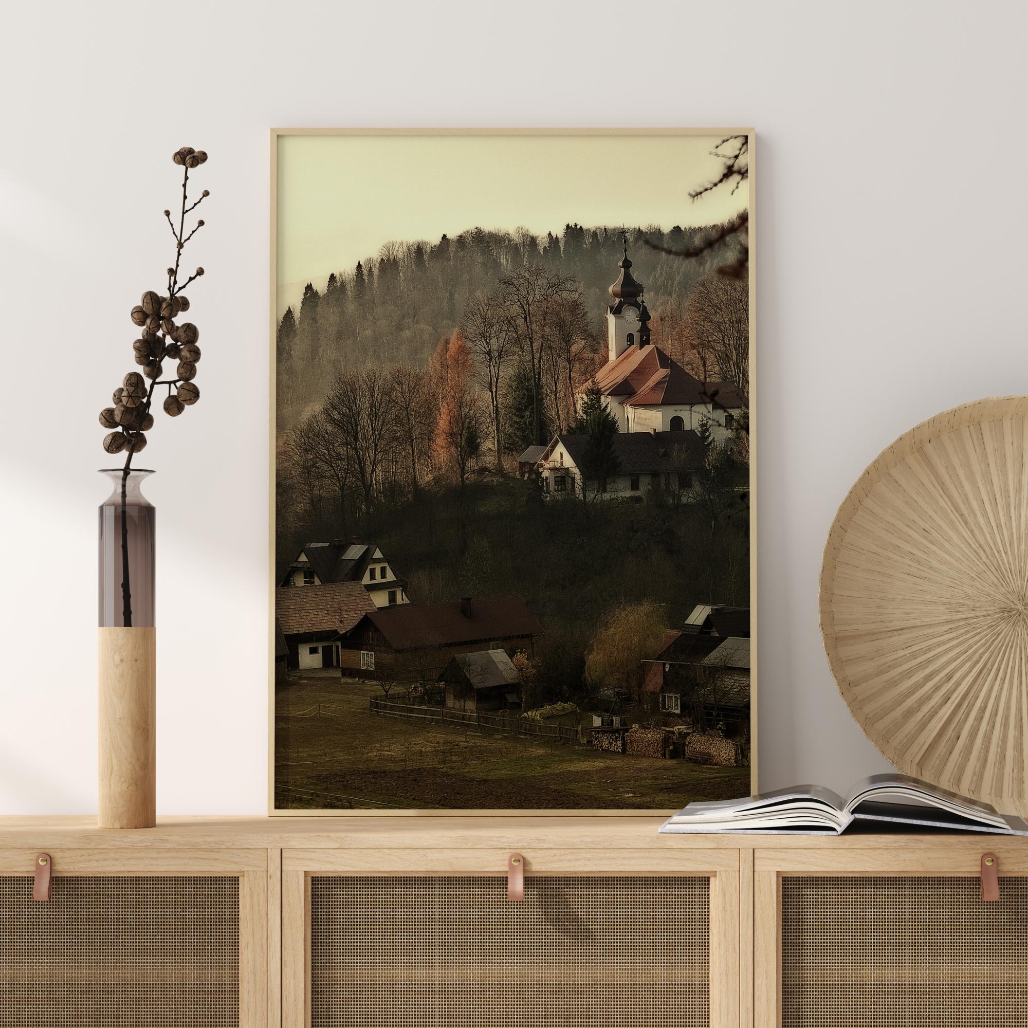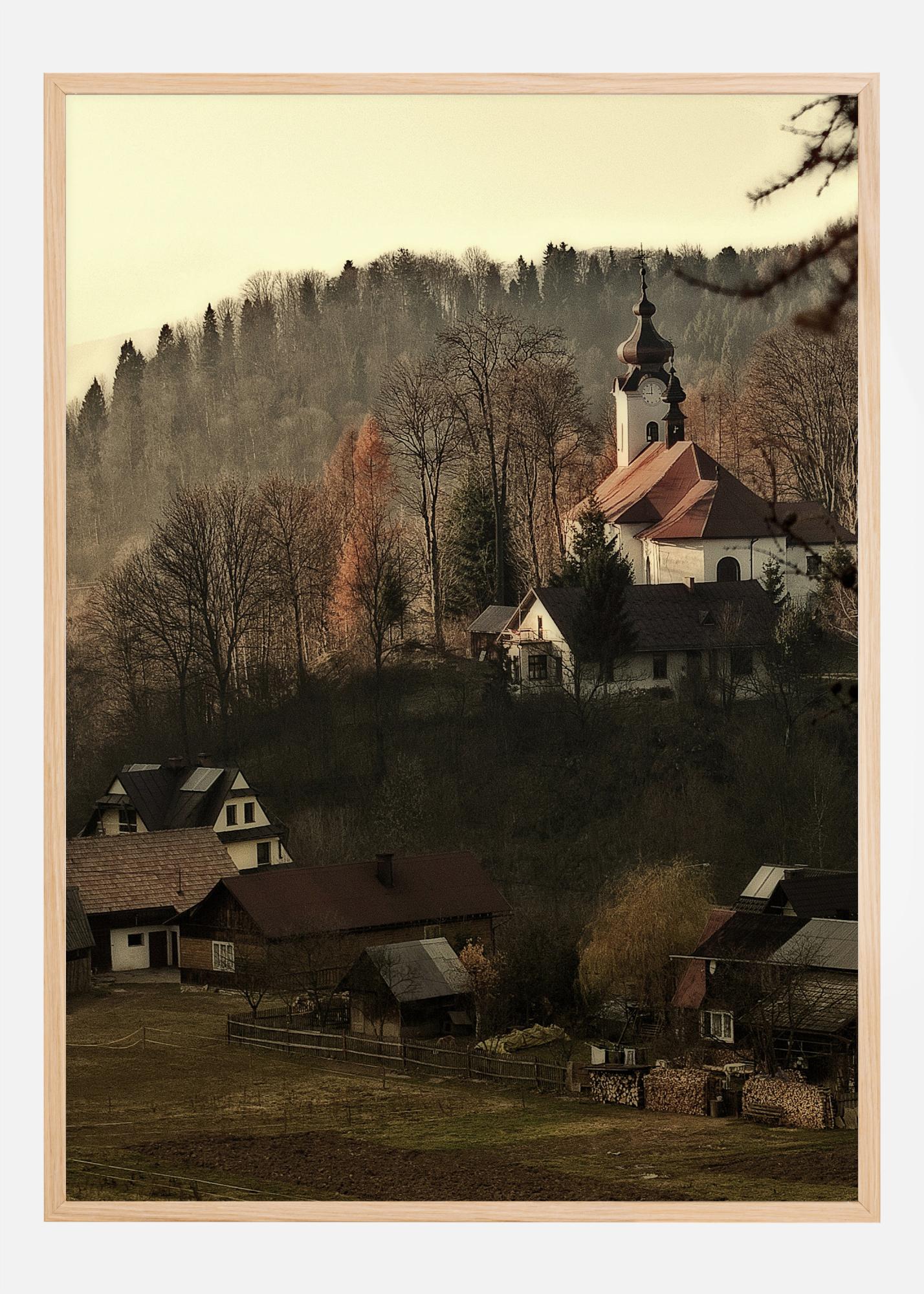 Ein Stadtbild-Poster eines kleinen abgelegenen Dorfes mit alten Häusern und Feldern, mit bewaldeten Bergen im Hintergrund. Ein weißer Kirchturm zeichnet sich hoch gegen die stumpfen Braun- und Grüntöne der Landschaft ab. Tauchen Sie in dieses friedliche Dorf und ihre Fantasie ein, wenn Sie dieses Poster an Ihre Wand hängen.