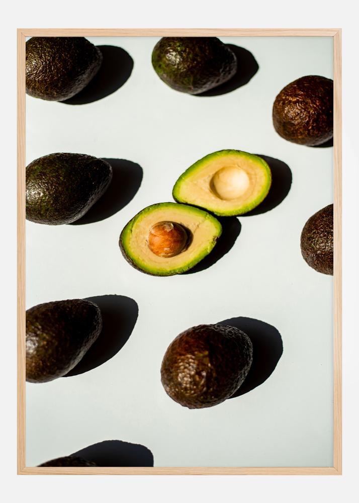 Dieses Poster ehrt die einfache Schönheit der Avocado, eine Frucht, die zu einer Ikone der gesunden Ernährung und modernen Küchentrends geworden ist. Die dunkelgrünen, knorrigen Schalen der ganzen Avocado stehen im Kontrast zu der einen Hälfte, die geöffnet ist und das glatte, hellgrüne Innere und den glänzenden, bräunlichen Kern offenbart. Dieses Spiel zwischen Textur und Farbe verleiht eine spielerische und zugleich stilvolle Ästhetik.
