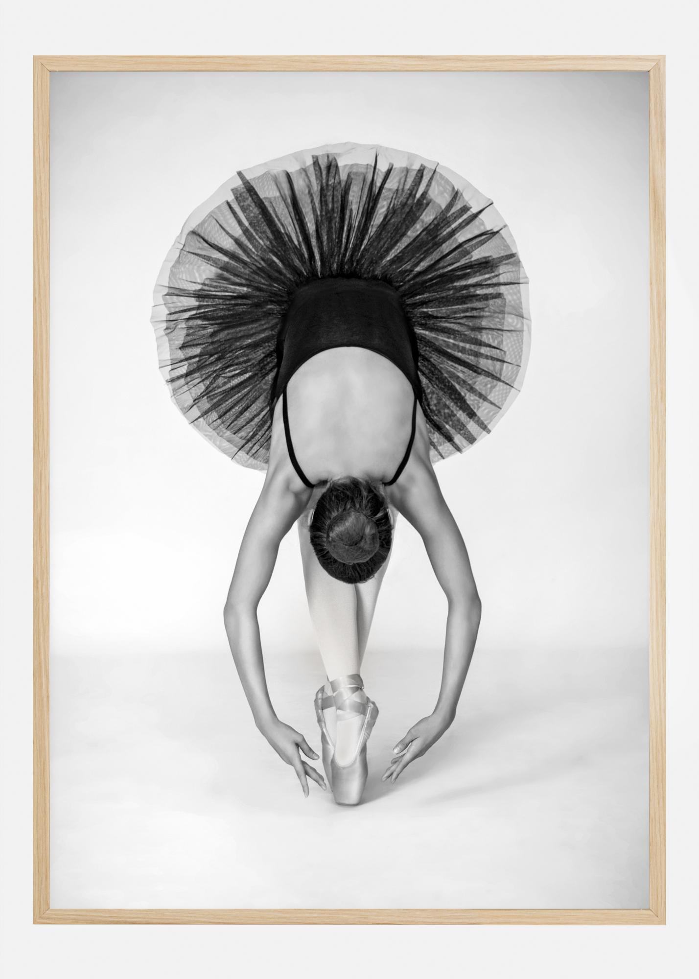 Ein Porträtplakat einer Ballerina. Diese Balletttänzerin beugt sich in fünfter Position nach vorne und bildet mit ihren Armen und einem schwarzen Tutu zwei perfekte Kreise. Das Schwarz-Weiß-Poster hebt sie hervor und schafft einen eleganten, klassischen Look, der eine einfache neutrale Wand überall in Ihrem Zuhause hervorhebt.