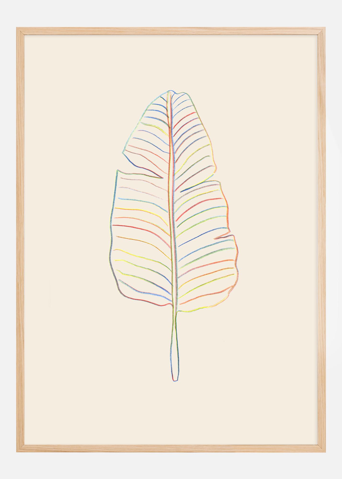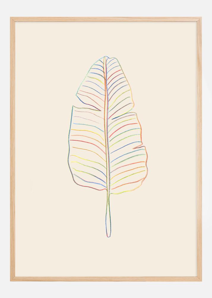 Dieses lebendige und farbenfrohe Poster stellt eine kreative Interpretation eines Bananenblatts mit Linien in einem Spektrum der Regenbogenfarben dar. Der spielerische Kontrast zwischen den natürlichen Formen des Blattes und den verspielten Farben verleiht der klassischen botanischen Kunst einen modernen Twist. Dieser Druck ist eine ausgezeichnete Darstellung, wie klassische Motive mit einem Farbtupfer in eine moderne Ästhetik verwandelt werden können.