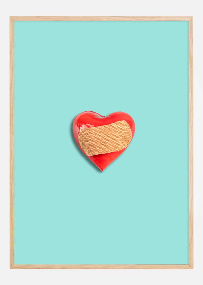 Dieses nachdenklich stimmende Poster zeigt ein rotes Herz mit einem Pflaster darauf, vor einem beruhigenden türkisfarbenen Hintergrund. Die Symbolik ist stark und offen für Interpretationen, sei es, ein gebrochenes Herz zu heilen oder sich um unsere emotionalen Wunden zu kümmern. Der lebendige Kontrast zwischen dem roten Herz und dem beruhigenden Hintergrund verleiht dem Bild eine tiefe emotionale Resonanz.