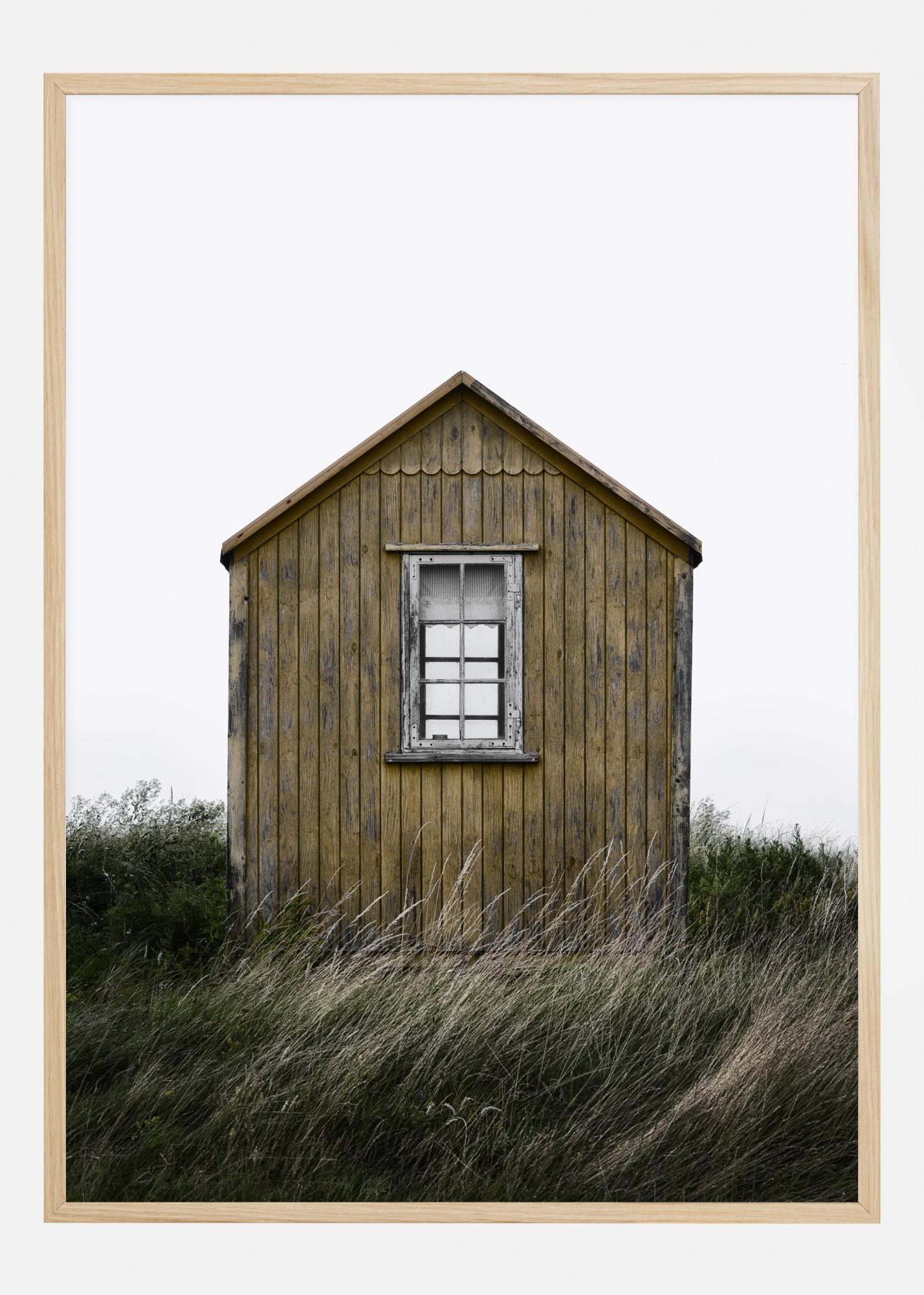 Ein elegantes Landschaftsposter mit einer einfachen Holzhütte am Strand. Die einsame Hütte steht auf windgepeitschten Dünen und Gras. Spüren Sie die Weite und Freiheit, wenn Sie dieses Poster in Ihr Zuhause hängen.