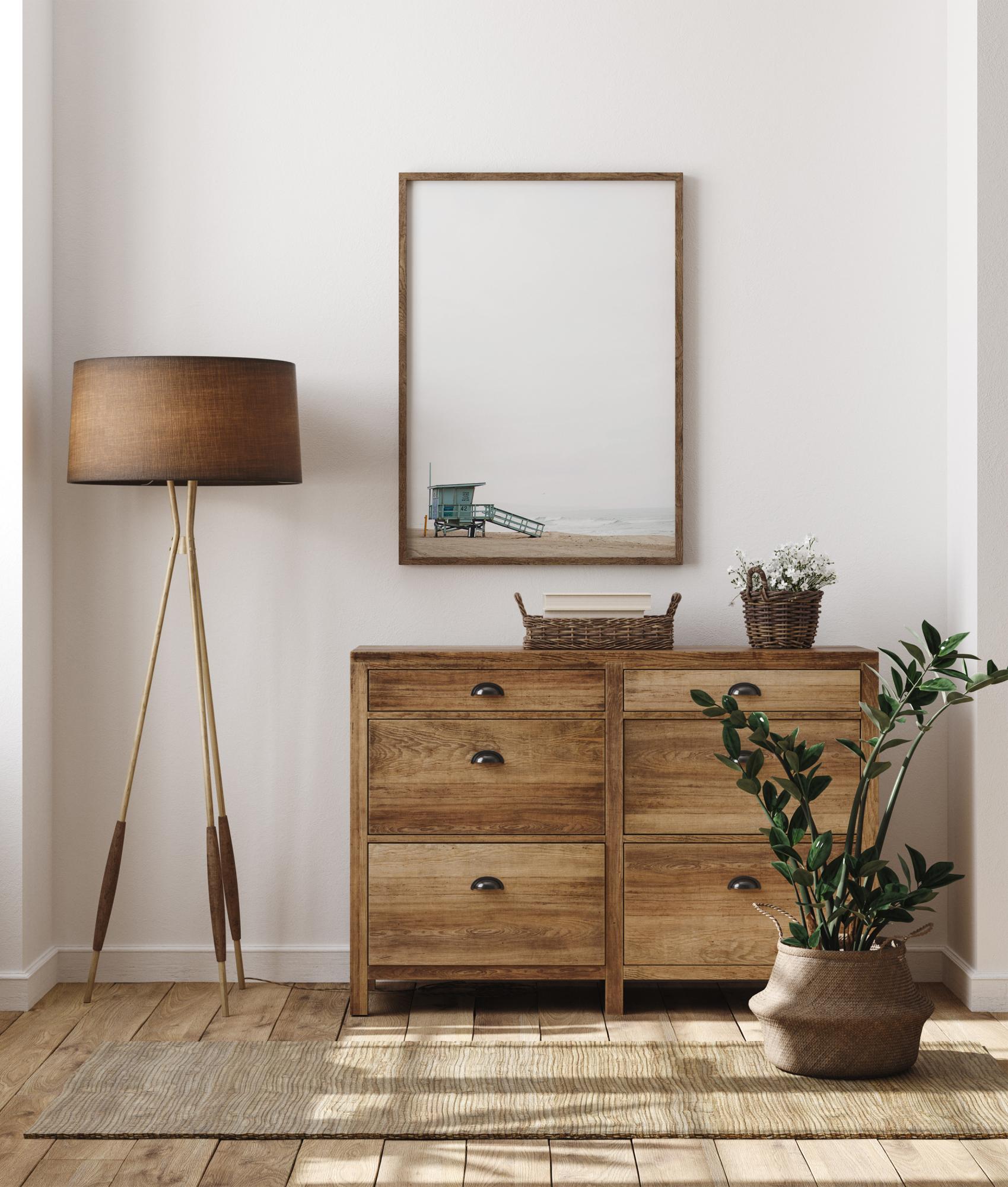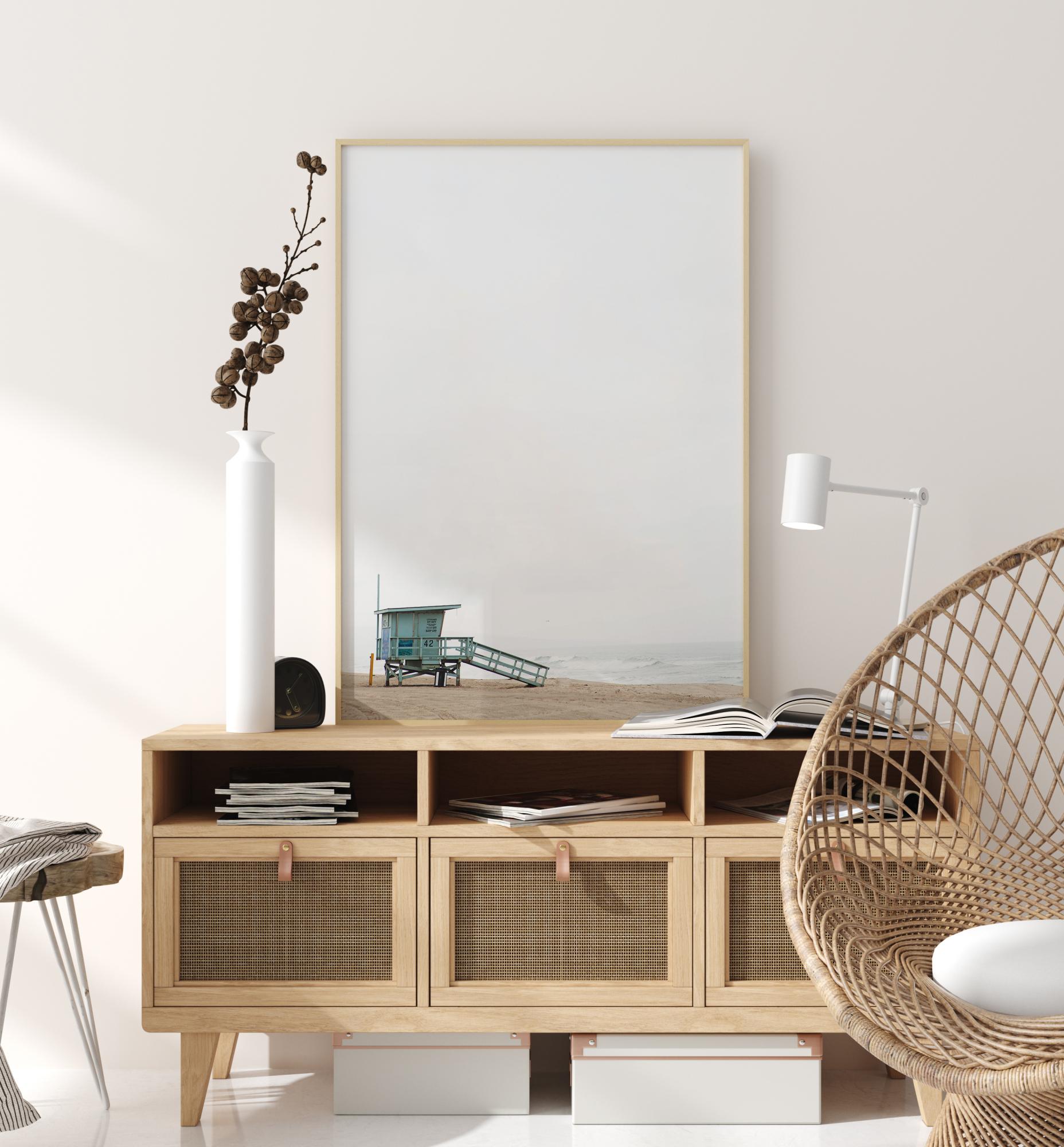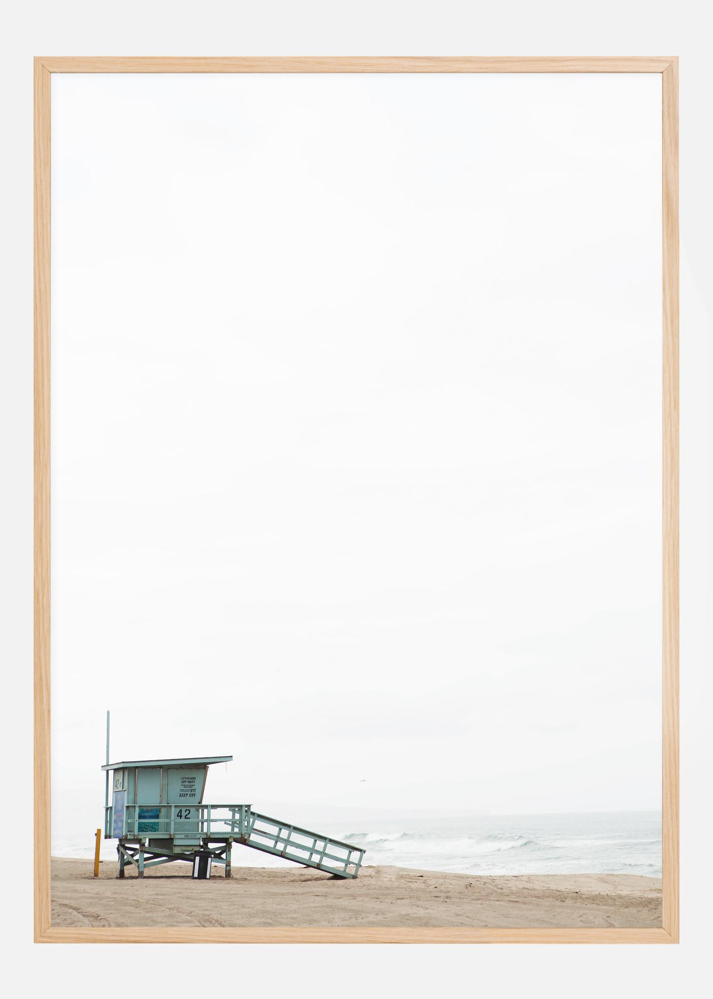 Ein minimalistisches Poster einer Rettungsschwimmerhütte am Rande des Strandes. Der weiße Himmel dehnt sich hoch über der Hütte aus und schafft ein Gefühl der Kleinheit, während die Rampe der Hütte den Blick hinunter zum Meer führt. Schaffen Sie ein Gefühl von Weite, wenn Sie es aufhängen.