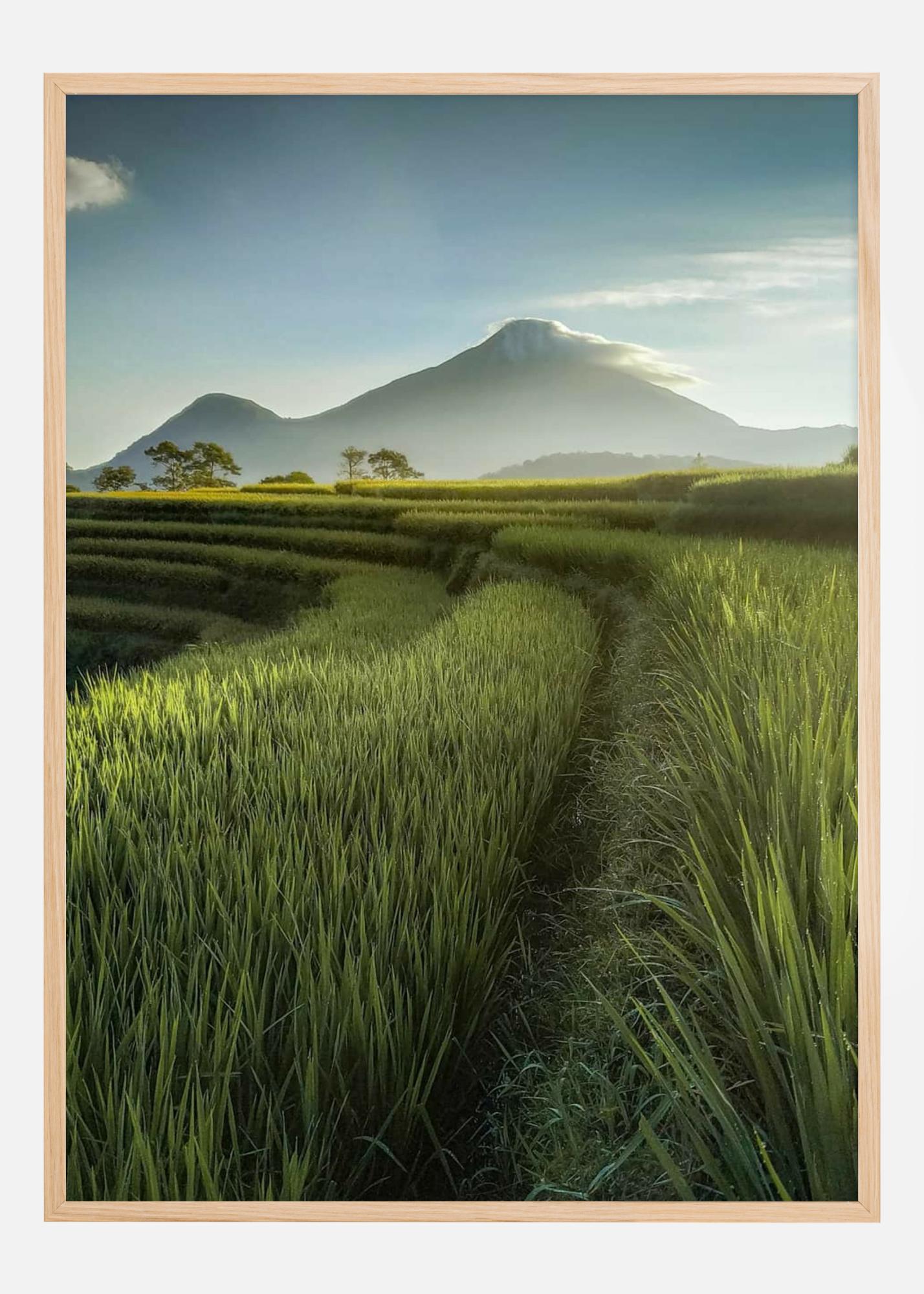 Dieses Poster bietet einen Blick auf eine pastorale Idylle, in der sich grüne Reisfelder vor dem Hintergrund majestätischer Berge und eines weichen Himmels erstrecken. Das über die Landschaft geworfene Licht verleiht ein warmes und einladendes Gefühl, was diesen Druck zu einer perfekten Möglichkeit macht, ein Stück der Ruhe und Schönheit der Natur in Ihr Zuhause oder Ihren Arbeitsplatz zu bringen.
