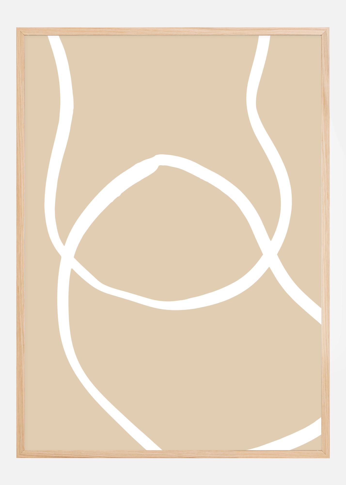 Ein minimalistisches Poster mit cremefarbenen Linien, die auf einem schlichten beigen Hintergrund Formen bilden. Die geschwungenen Linien ziehen sich über die Leinwand und kreuzen sich in der Mitte, um den Blick auf die sich überlappende Kreisform zu lenken. Hängen Sie es an eine leuchtend blaue Wand und bringen Sie das Beige zum Leuchten.