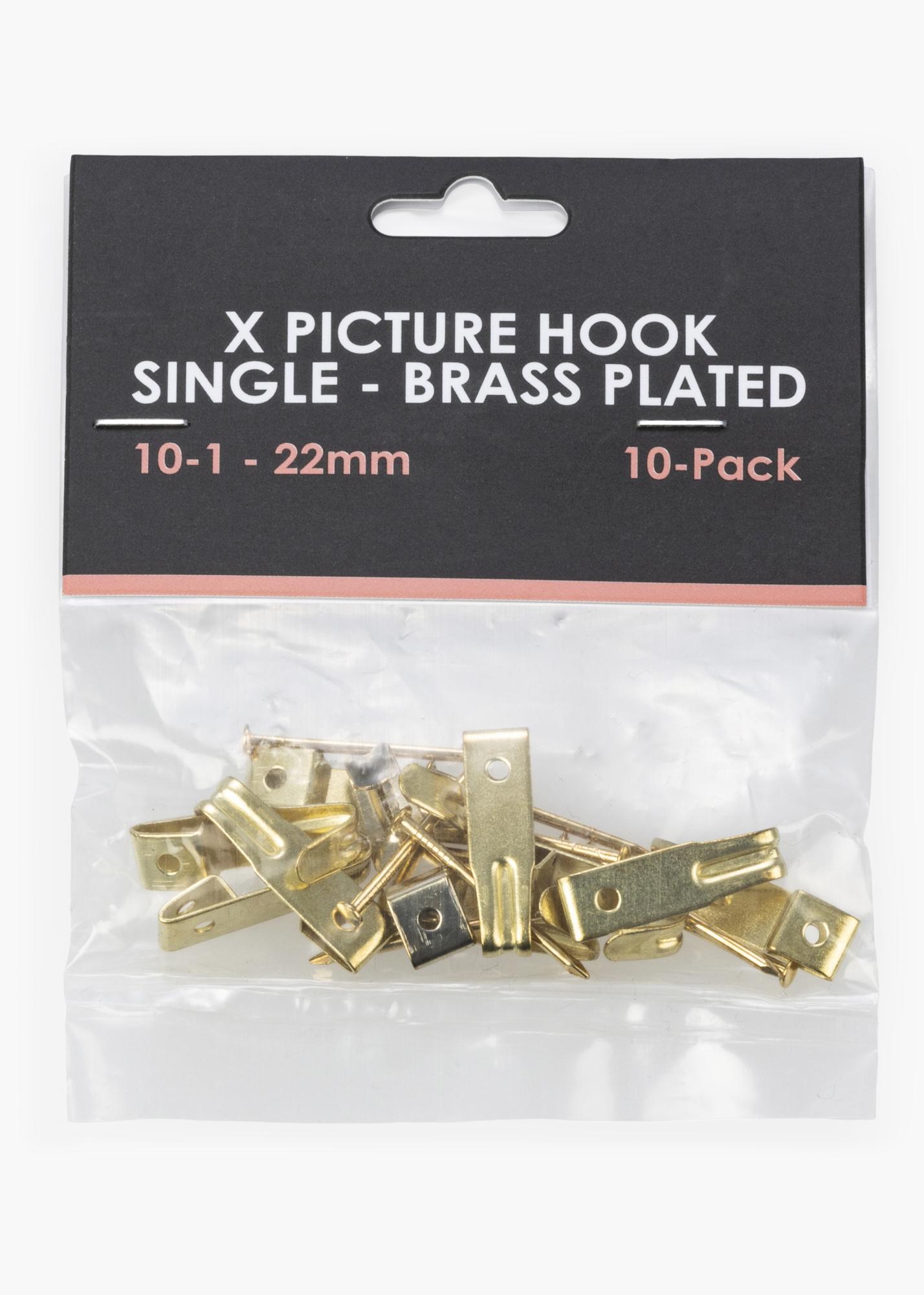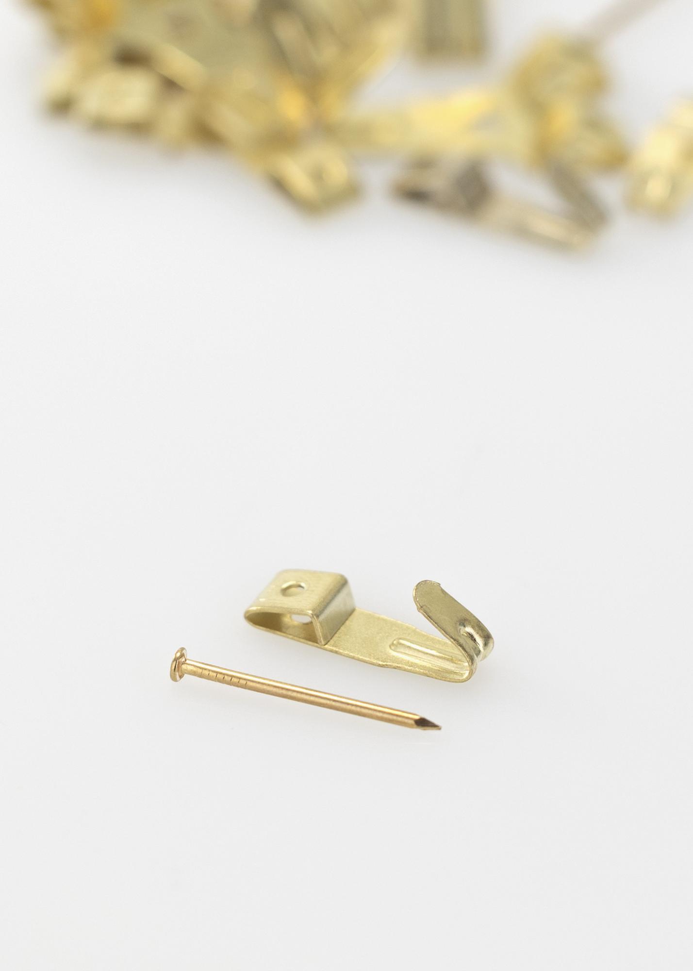 Bilderhaken mit Stiften für die Befestigung an Holz- oder Gipswänden. Hält eine Belastung bis zu 5 kg aus. Messingfarben. Für Tipps und Tricks, wie du deine Bilder an einer Gipswand aufhängen kannst, schau einfach rein in unseren Guide – Bilderrahmen an einer Gipswand befestigen -