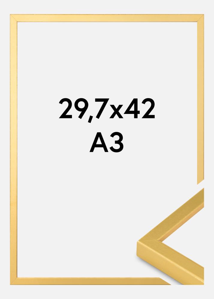 Dieser Fotorahmen ist eine perfekte Kombination aus Eleganz und Modernität, was ihn zu einer ausgezeichneten Wahl macht, um Ihre Lieblingsmotive hervorzuheben. Mit einer Größe von 29,7x42 cm (A3) eignet er sich perfekt, um größere Bilder oder Kunstwerke zu präsentieren. Die goldfarbene Oberfläche hat einen subtilen Glanz und eine leicht strukturierte Oberfläche, die einen exklusiven und anspruchsvollen Ausdruck verleiht.
