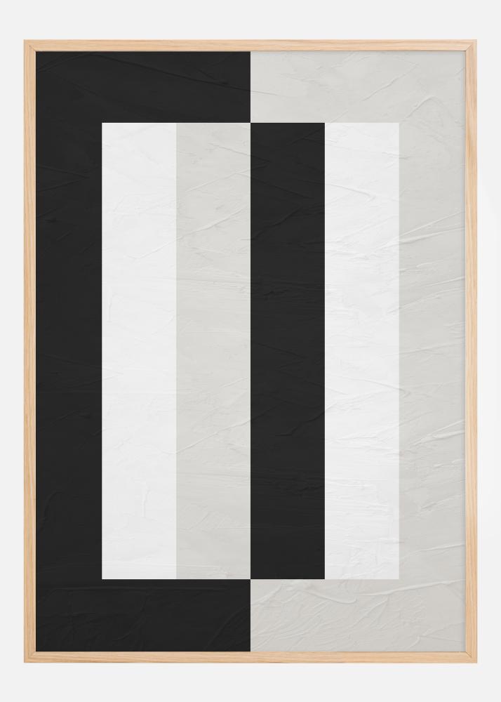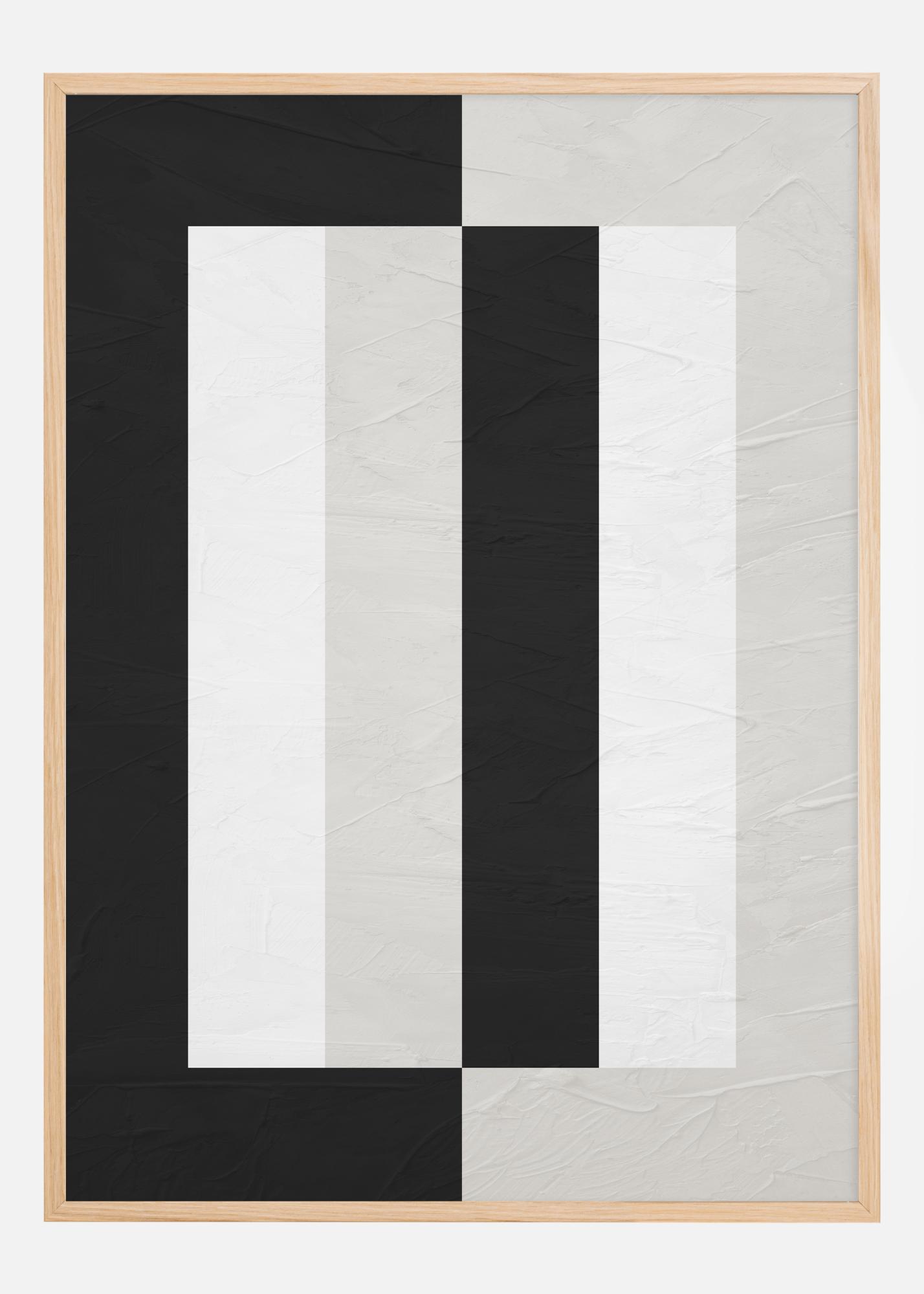Dieses raffinierte Poster präsentiert eine mutige und grafische Komposition, die sofort die Aufmerksamkeit des Betrachters fesselt. Die kontrastreiche Kombination aus Schwarz und Weiß bildet eine Serie vertikaler Linien und Blöcke, die eine optische Illusion von Tiefe und Bewegung erzeugt. Dieses Plakat ist ideal für den modernen Inneneinrichter, der nach einem aussagekräftigen Kunstwerk sucht, das ein Gefühl von Eleganz und zeitgenössischem Design vermittelt. Die zurückhaltende Farbpalette erleichtert es, dieses Bild in verschiedene Räume und Umgebungen zu integrieren.