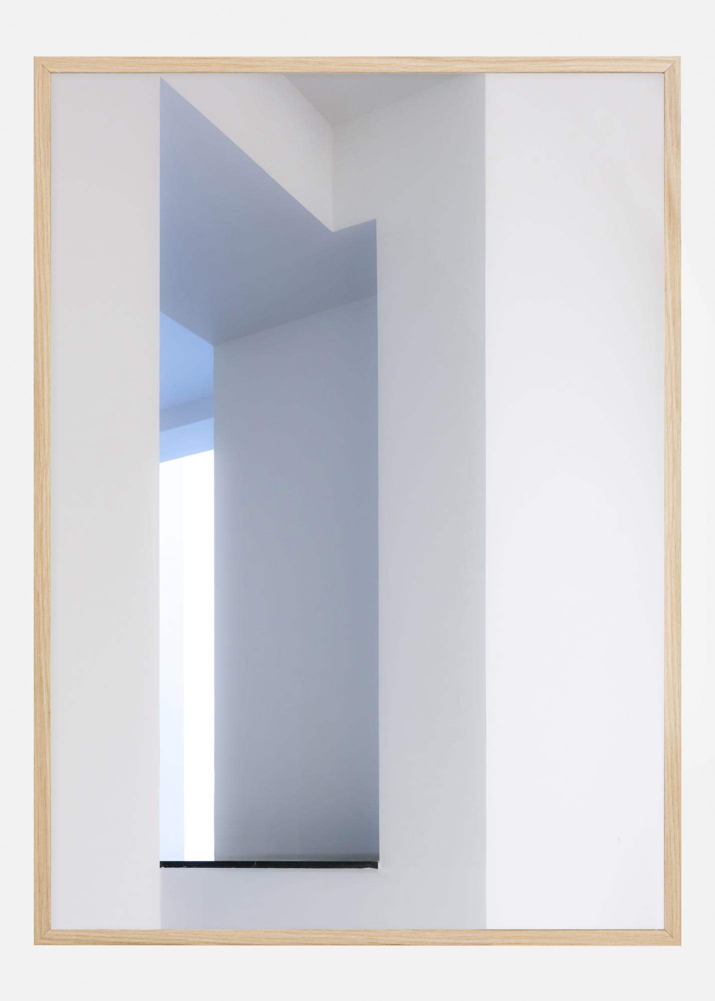 Ein Poster für Innenräume mit Wänden und einem Fenster. Die weißen und grauen Wände und geometrischen Formen lenken den Blick auf das Fenster und die helle weiße Wand und den blauen Himmel dahinter. Hängen Sie dieses Poster in einem dunkleren Raum auf, um das Gefühl und die Illusion von Licht und Weite zu vermitteln und ihn aufzuhellen.