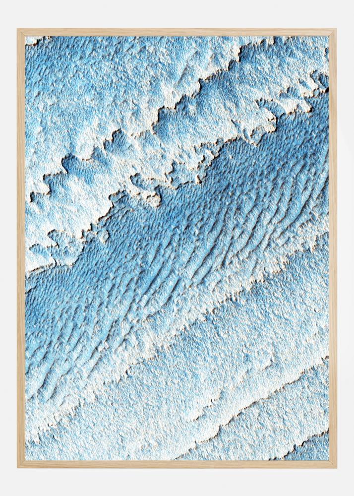 Ein Luftbildposter von Wellen, die an das Ufer schlagen. Weißer Schaum säumt jede Welle, während das Wasser kräuselt und auf das Land zufließt. Leuchtend blaue und azurblaue Farben machen dieses Bild zu etwas ganz Besonderem. Kombinieren Sie es mit einer orangefarbenen Wand, um die volle Wirkung dieser Komplementärfarben zu erzielen.