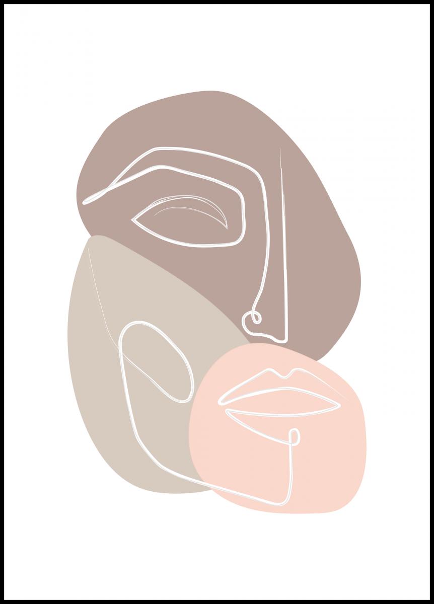 Ein einfaches Poster mit drei Formen und Linien, die einen Teil eines abstrakten Gesichts bilden. Braune, graue und rosafarbene kreisförmige Formen sind in der Mitte eines weißen Hintergrunds zusammengeballt. Weiße Linien wirbeln darüber und bilden einen Mund, eine Nase und ein Auge. Verwandeln Sie Ihr Haus in eine Galerie mit diesem einzigartigen abstrakten Poster.