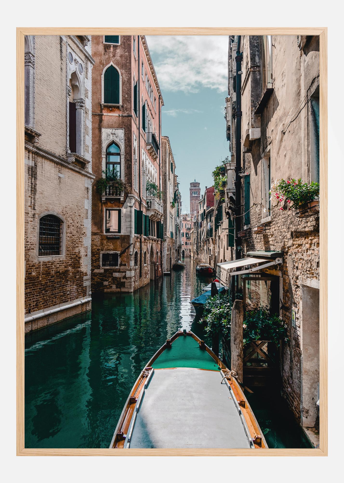 Dieses fesselnde Poster fängt die Essenz eines malerischen Kanals in Venedig ein, komplett mit traditioneller Gondel im Vordergrund. Das Licht fällt wunderschön über die farbenfrohen Fassaden der umliegenden Gebäude, und die Reflexionen im stillen Wasser schaffen eine Spiegelung, die sowohl klar als auch bezaubernd ist. Nuancen von erdigen roten und orangenen Tönen im Mauerwerk der Gebäude kontrastieren mit der ruhigen aquatischen blaugrünen Farbe des Kanals.