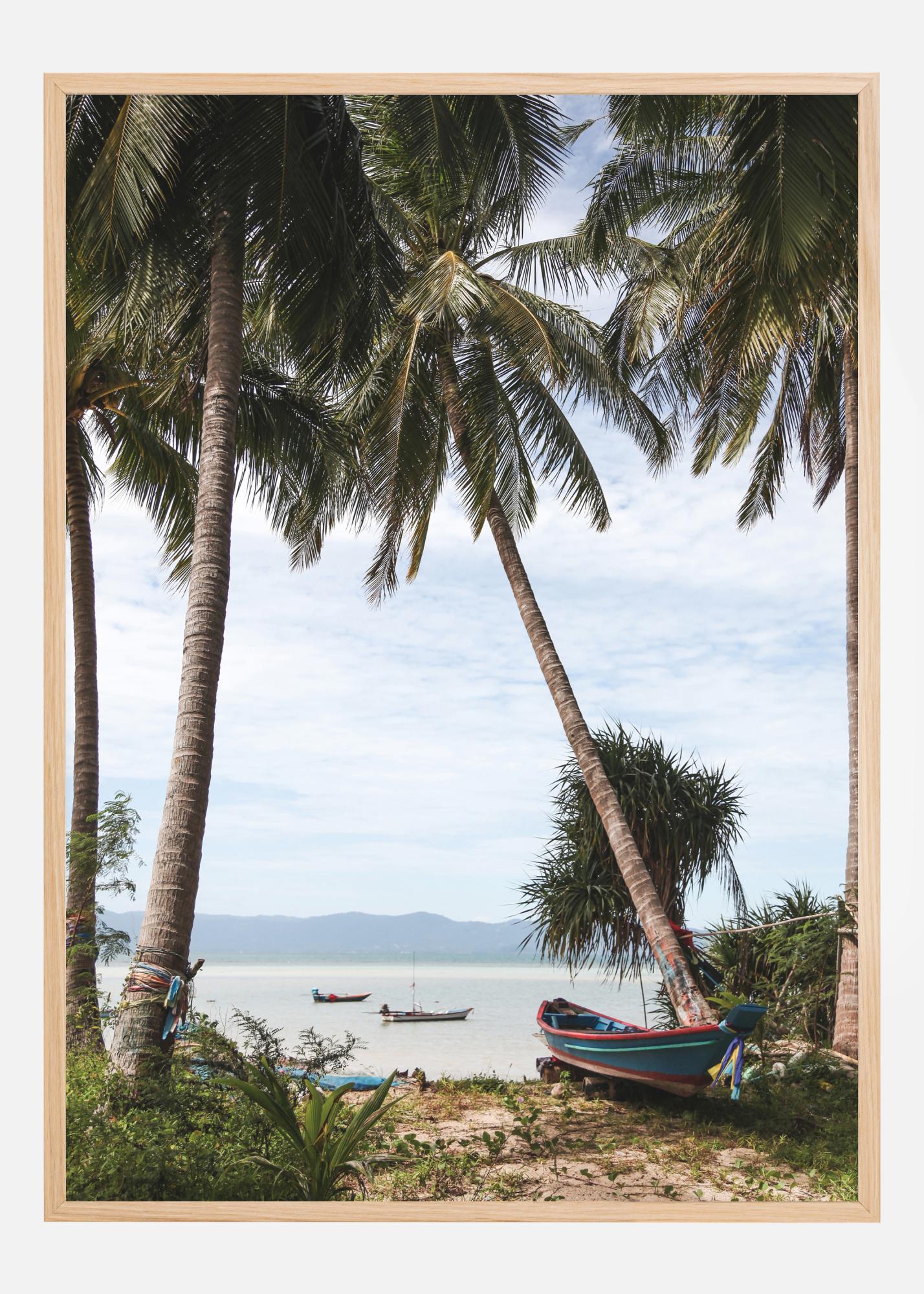 Ein Urlaubsposter mit Palmen und Booten in Thailand. Zwei Palmen lehnen sich aneinander und rahmen das Meer ein, hinter denen zwei Boote liegen. Ein drittes, rot-blaues Boot liegt an Land und zieht den Blick auf sich. Stellen Sie sich vor, Sie wären am Strand in diesem ruhigen Bild.