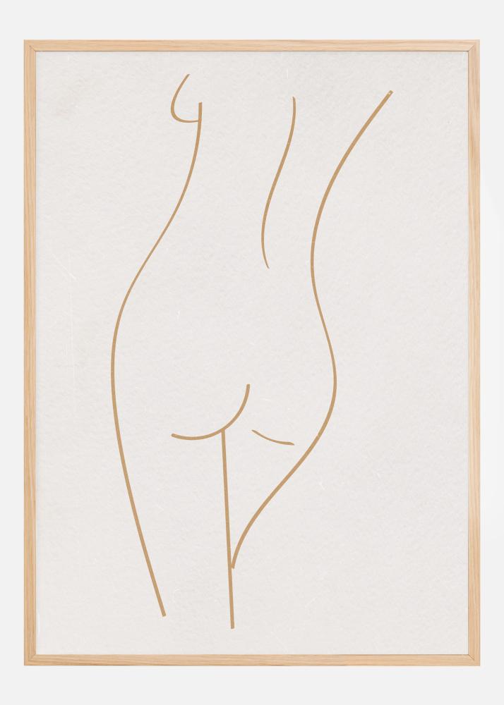 Ein einfaches Poster mit Linienzeichnung des Rückens einer Frau. Dünne braune Linien sind alles, was man braucht, um die Form einer von hinten posierenden Frau zu schaffen. Die Linien lenken den Blick auf den Rücken der Frau in dieser einfachen, aber eleganten Zeichnung auf einem weißen Hintergrund.