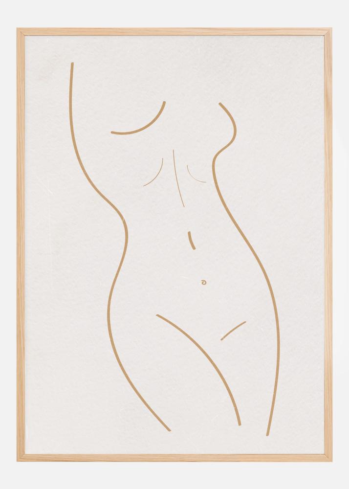 Ein lebensechtes Poster einer Frau mit braunen Linien. Starke, kräftige braune Linien umreißen die Beine, den Bauch und die Brust der Frau. Die Linien sind glatt und fließen aufwärts in dieser eleganten Aktzeichnung. Hängen Sie es an eine schlichte weiße Wand, um das Gefühl einer Galerie zu vermitteln.