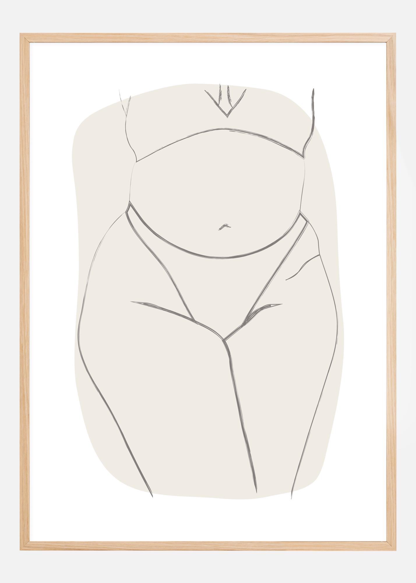 Ein einfaches Poster mit einer Zeichnung von Bauch und Beinen einer Frau. In einer zurückhaltenden Position zeigen die Linien die gekreuzten Beine der Frau, die einen einfachen Bikini trägt. In hellem Grau hervorgehoben, heben sich die kräftigen Linien ab, um das Werk eines Künstlers zu schaffen. Kombinieren Sie es mit einer farbigen Wand für einen auffälligen Look.