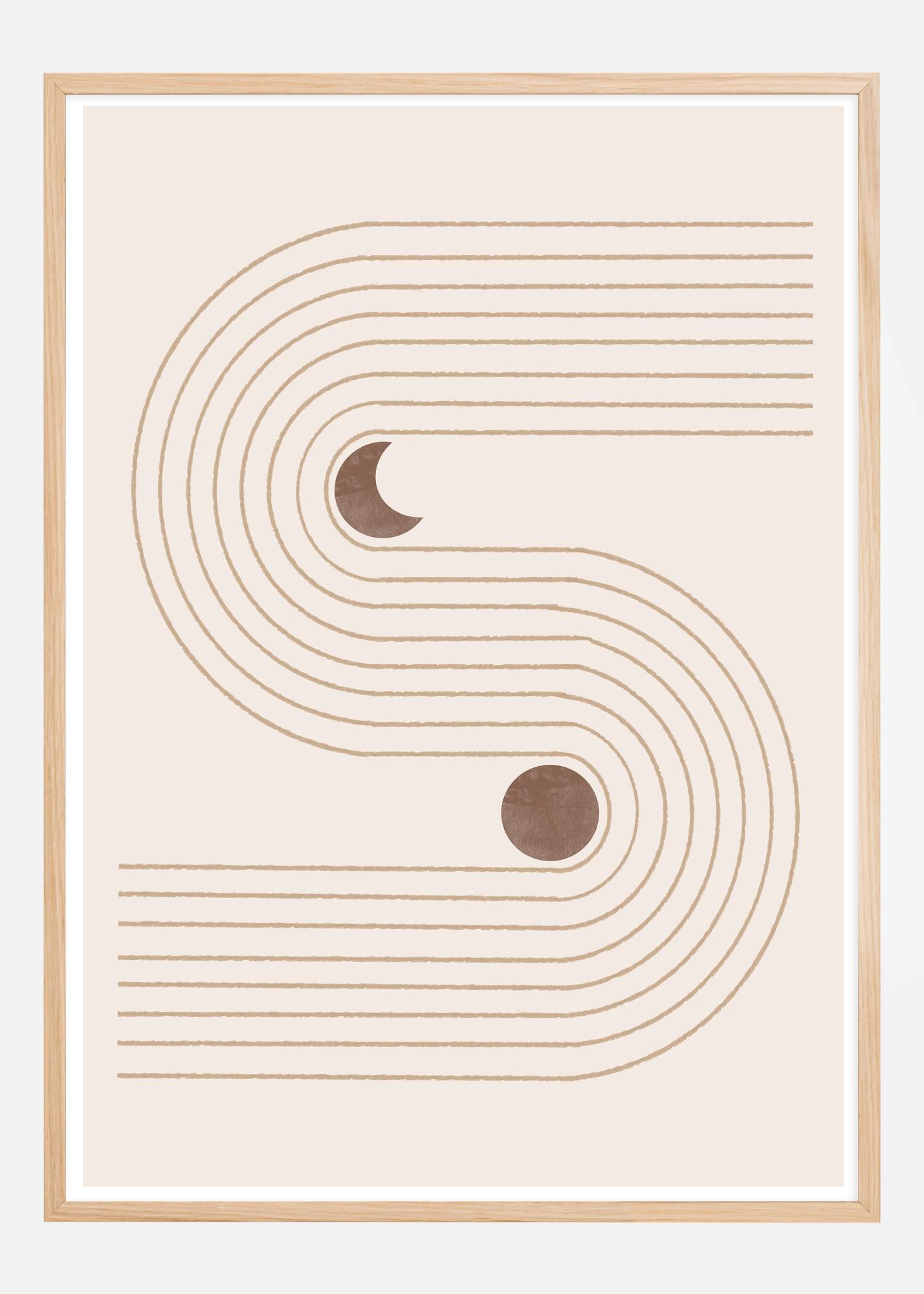 Dieses Poster bietet eine minimalistische Interpretation von böhmischen Formen und Himmelskörpern mit seinen geschwungenen Bögen und Linien, die ein harmonisches Muster bilden. Es verfügt über eine beruhigende Palette von erdigen Farbtönen, mit dunklen braunen Kreisen, die Monde oder Planeten darstellen können, was dem Design eine kosmische Note verleiht. Die Bögen vermitteln ein Gefühl von Bewegung und Fluss, während die runden Formen ein Element von Balance und Symmetrie hinzufügen.