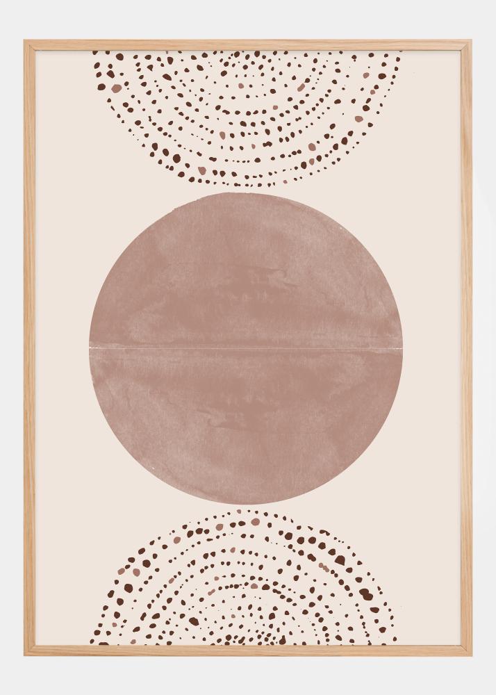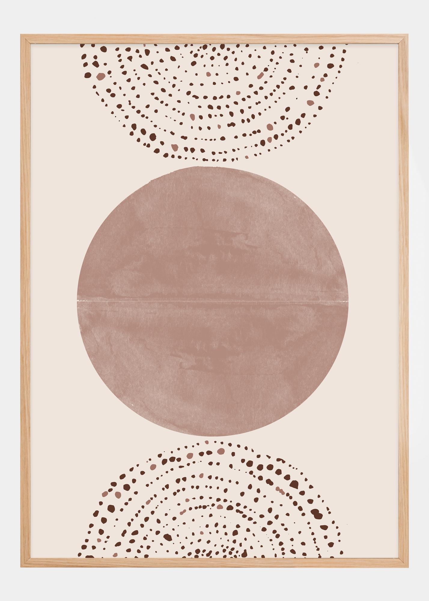Dieses raffinierte und beruhigende Poster hebt einen großen, weichen terrakottafarbenen Kreis als Zentrum in einer Komposition feiner, verstreuter Punkte hervor, die schwebende Halbkreise darüber und darunter bilden. Dieses Motiv ist von böhmischem Design inspiriert und verleiht ein entspanntes, erdiges Gefühl, während es gleichzeitig einen modernen Touch in den Raum bringt, den es schmückt.
