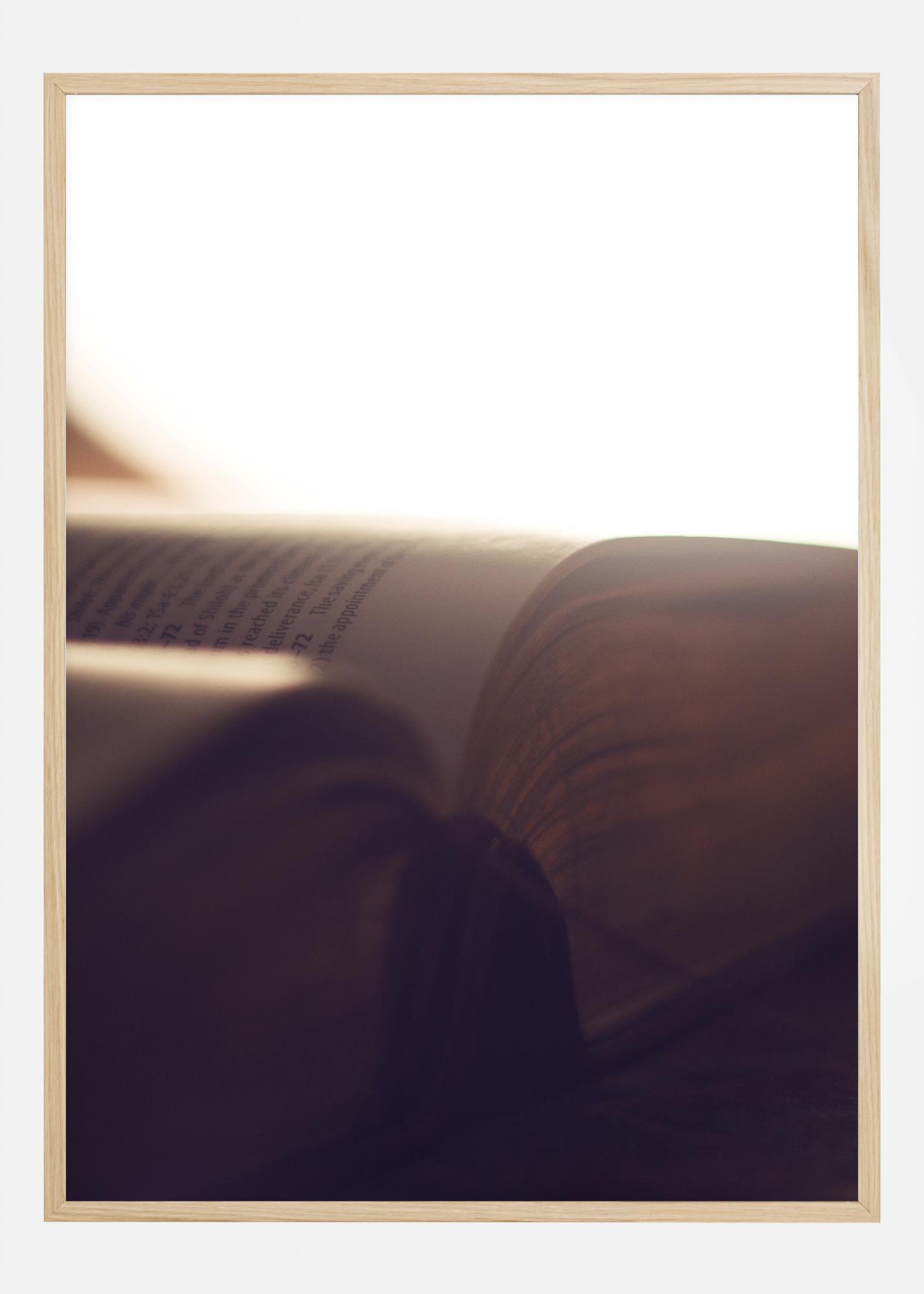 Ein Poster mit einer Nahaufnahme der Seite eines Buches. Helles, weißes Licht füllt den größten Teil dieses Bildes aus, da es auf das Buch scheint und die goldfarbenen Kanten der Seiten beleuchtet. Das Buch wölbt sich auf und die Wörter sind auf der Seite gerade noch sichtbar. Es ist der perfekte Druck für ein Arbeitszimmer.