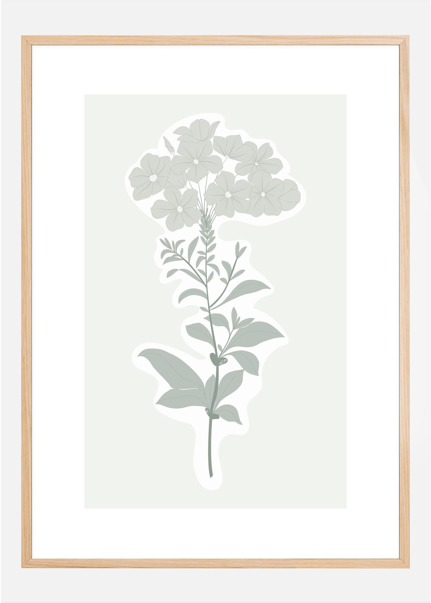 Ein florales Poster mit einem einfachen botanischen Druck einer Blume und ihrer Blätter. Sanfte grau-grüne Farben bilden den einfachen, aber eleganten Stiel mit Blumen. Das Poster ist weiß und grau gerahmt und erweckt botanische Illustrationen im alten Stil zum Leben. Zeigen Sie Ihre Gartenanlage mit diesem bezaubernden Druck.