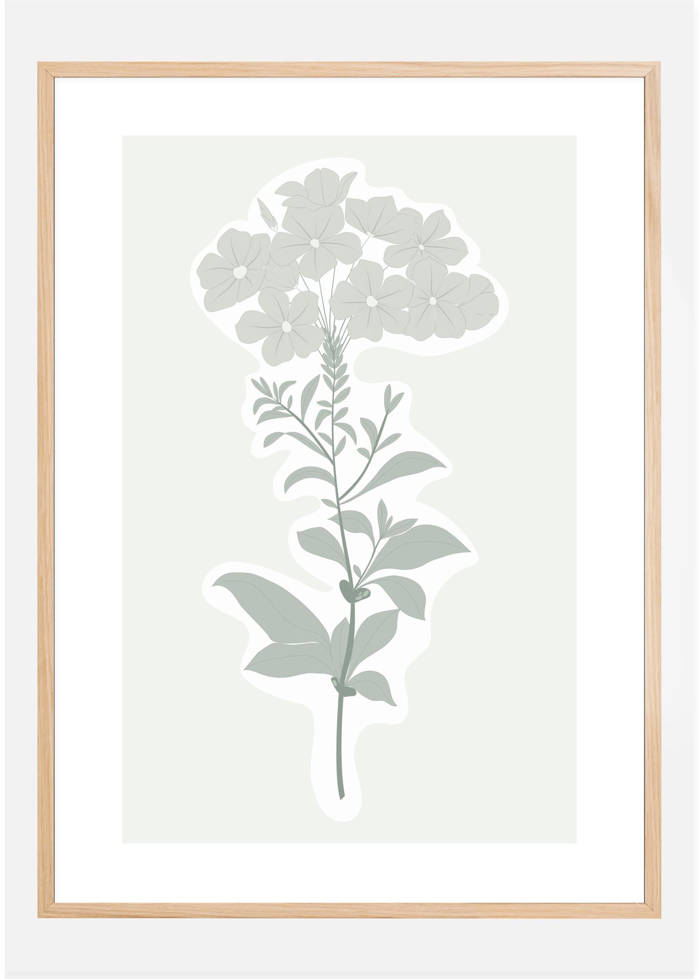 Ein florales Poster mit einem einfachen botanischen Druck einer Blume und ihrer Blätter. Sanfte grau-grüne Farben bilden den einfachen, aber eleganten Stiel mit Blumen. Das Poster ist weiß und grau gerahmt und erweckt botanische Illustrationen im alten Stil zum Leben. Zeigen Sie Ihre Gartenanlage mit diesem bezaubernden Druck.