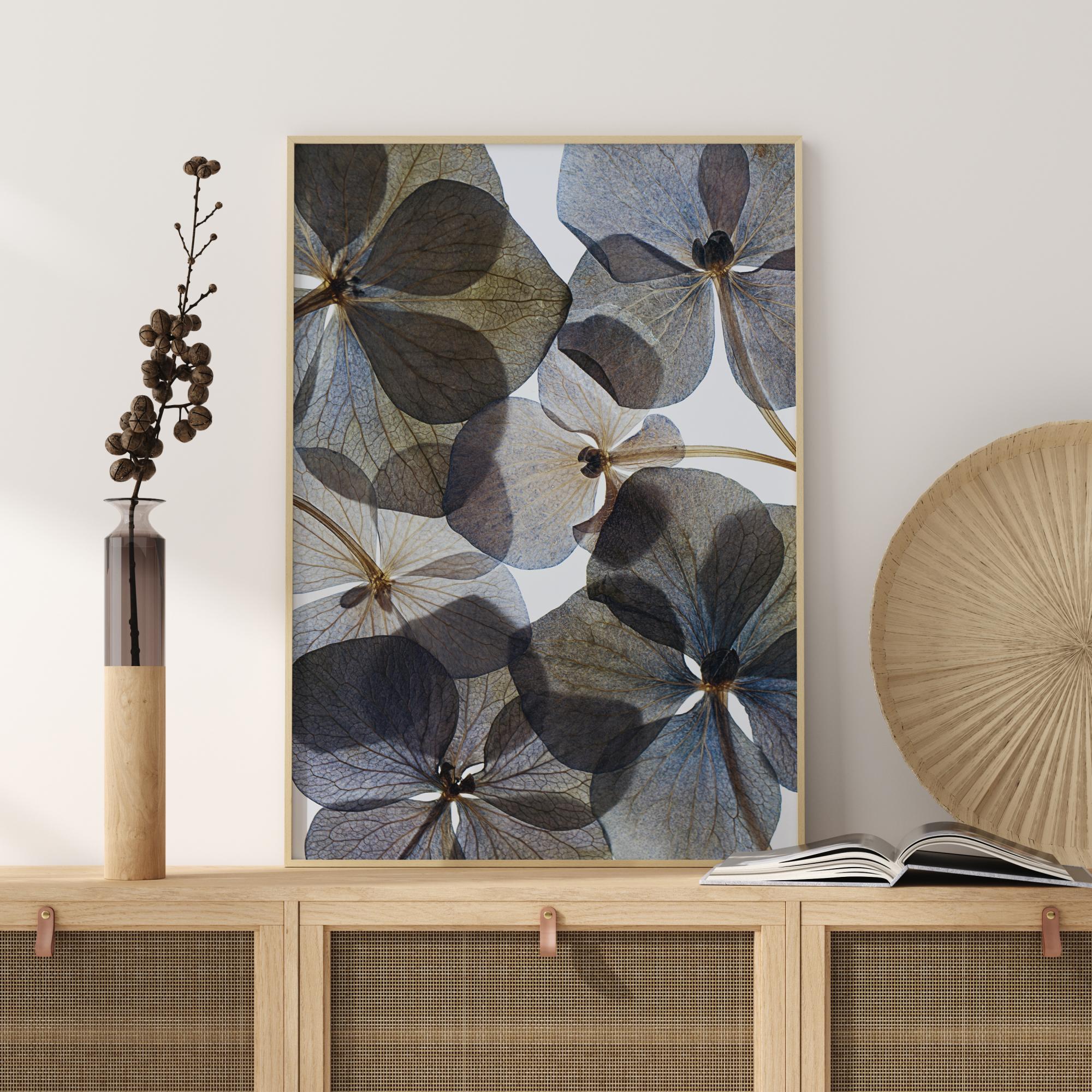 Ein botanisches Poster mit transparenten blauen und braunen Blumen. Das weiße Licht des Hintergrunds scheint durch die Blütenblätter hindurch, von denen sich einige überlappen, so dass sie dunkler sind als andere. Hängen Sie dieses Poster auf und stellen Sie sich vor, Sie befänden sich unter diesen atemberaubenden, breiten Blütenblättern, um eine ruhige Stimmung zu erzeugen.