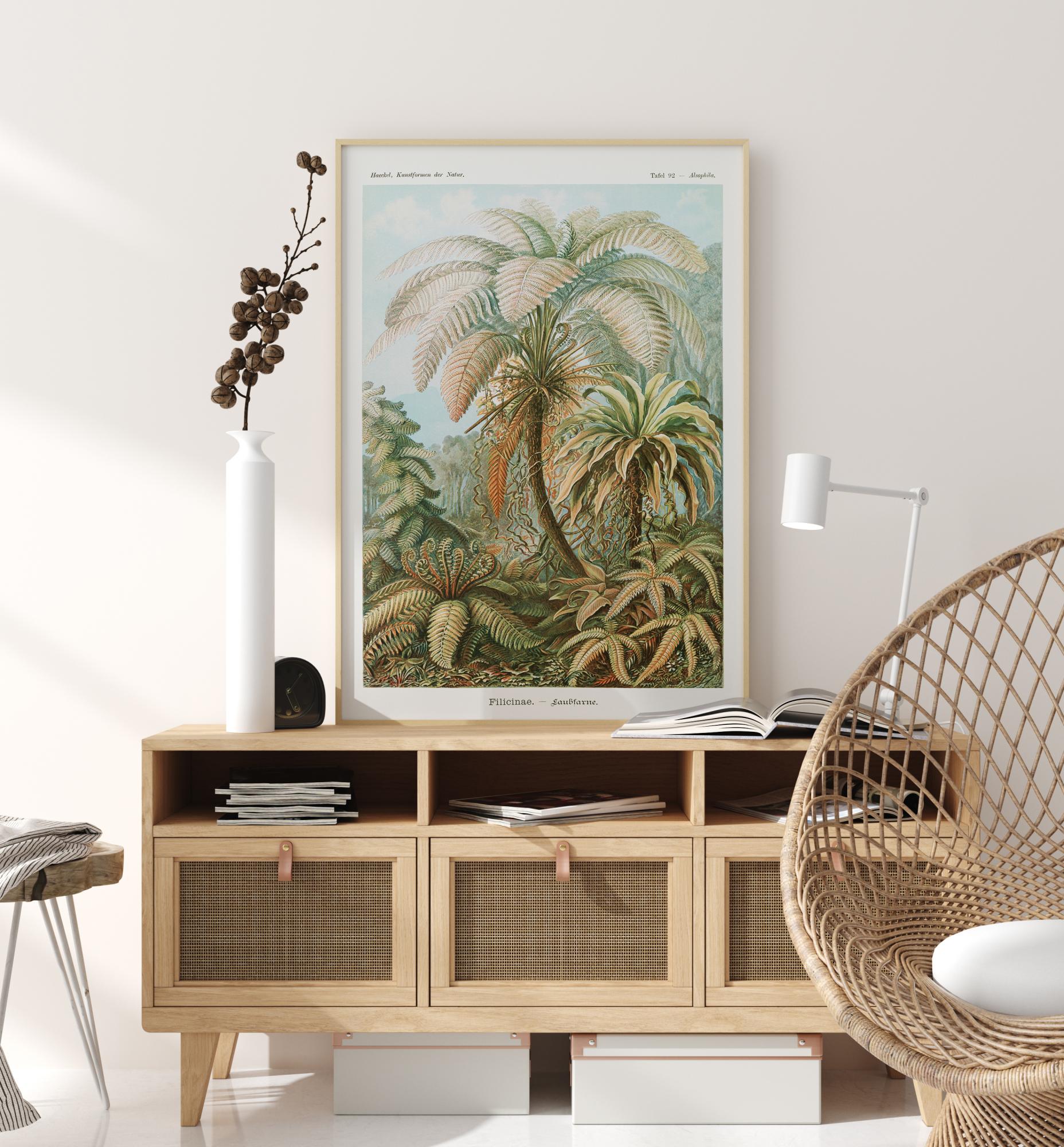 Ein Poster mit einer Illustration verschiedener botanischer Pflanzen. Große Palmwedel und Farne sprießen in diesem Bild. Grün-, Blau- und Orangetöne schaffen einen sanften Ton in dieser antiken deutschen wissenschaftlichen Zeichnung. Bringen Sie mit diesen Pflanzen und ihren lateinischen Namen einen Hauch von Altem in Ihr Haus.