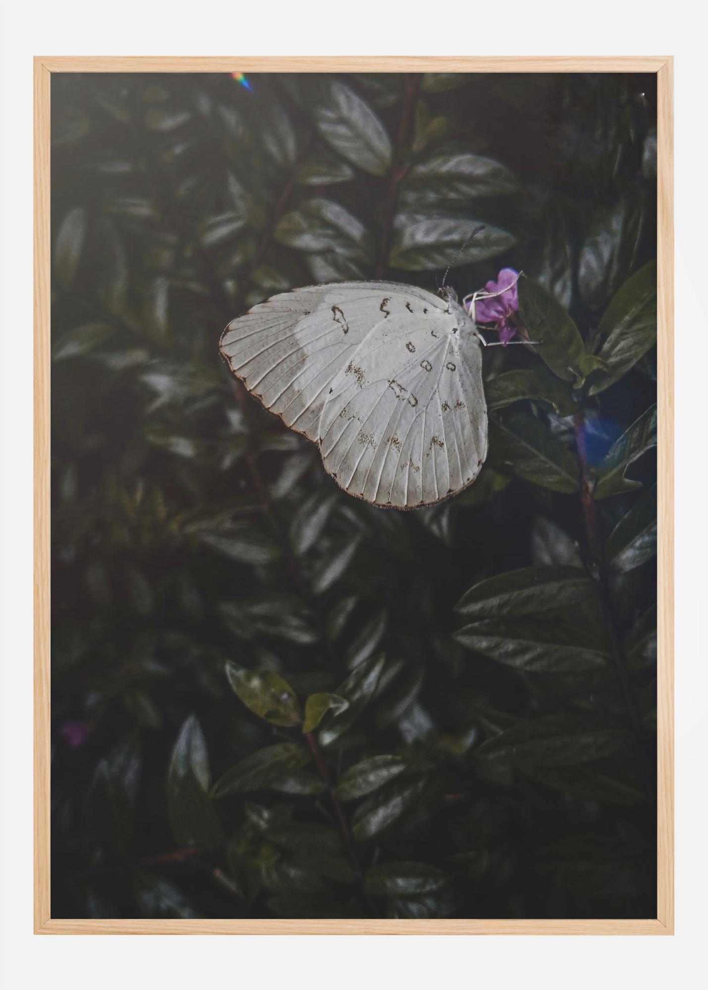 Entdecken Sie die stille Schönheit der Natur durch dieses nachdenkliche Poster, das einen zarten Schmetterling in Ruhe darstellt. Er ist elegant vor einem üppigen Hintergrund aus dunkelgrünen Blättern platziert und seine blassweißen Flügel mit subtilen Mustern aus Grau und Schwarz betonen seine Zerbrechlichkeit und Anmut. Dieses Bild ist eine leise Erinnerung an die flüchtigen und bezaubernden Momente der Natur.