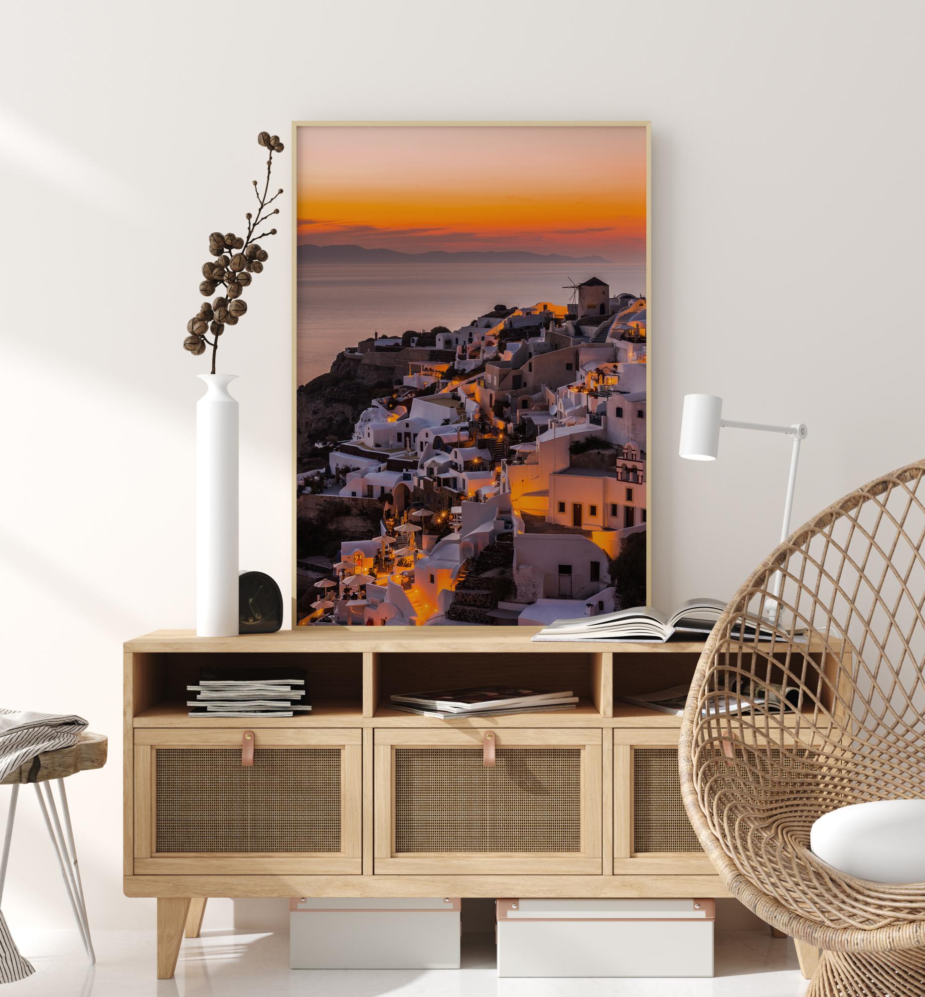 Ein malerisches Poster von Calispera Santorini bei Sonnenuntergang. Die kleine Stadt leuchtet sanft in den leuchtend orangefarbenen Straßenlaternen. Die weißen Häuser heben sich von dem sanften, nebligen Meer und den Bergen im Hintergrund und dem leuchtend orangefarbenen Himmel bei Sonnenuntergang ab. Reisen Sie, ohne Ihr Haus zu verlassen, wenn Sie dieses Poster betrachten.