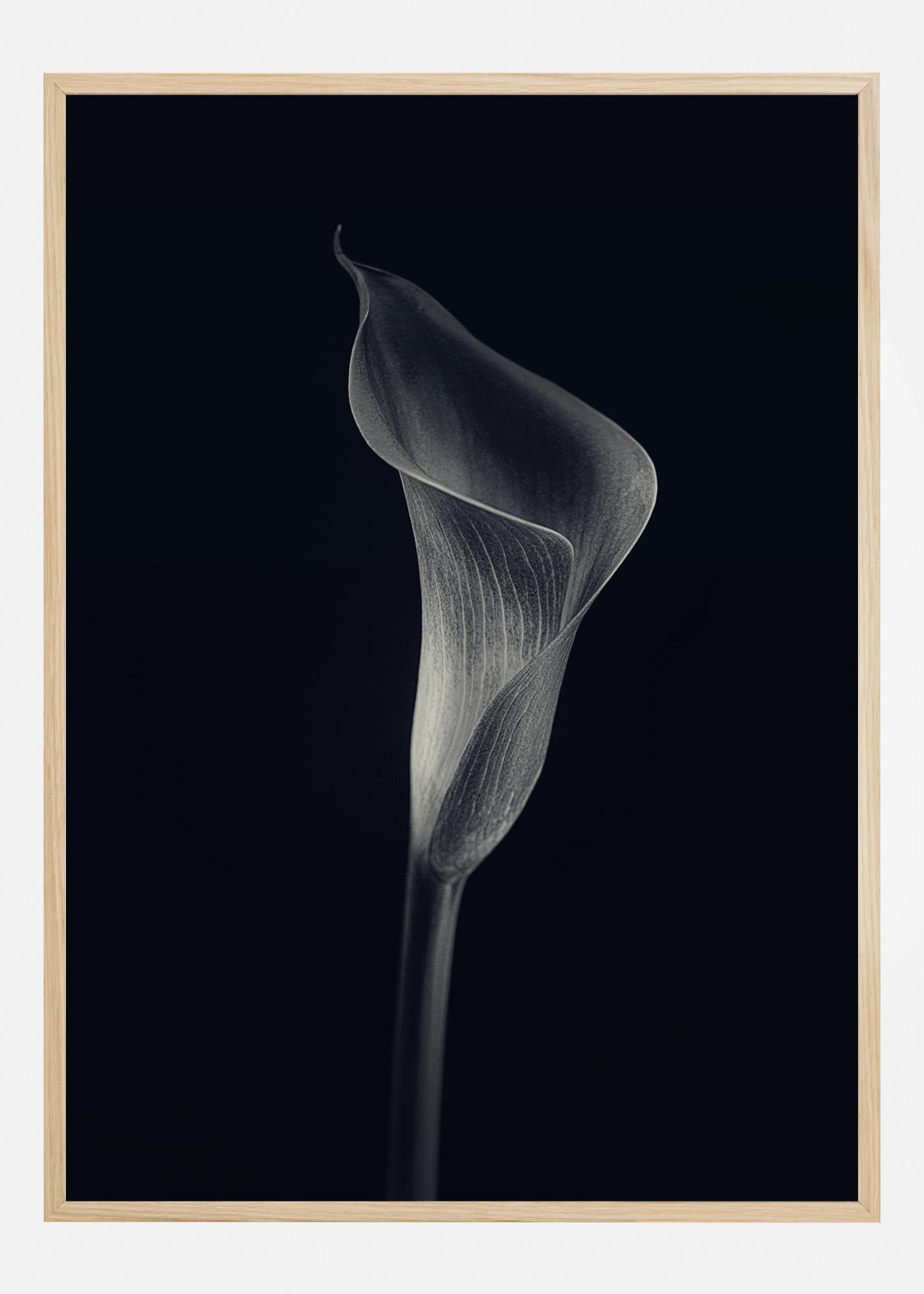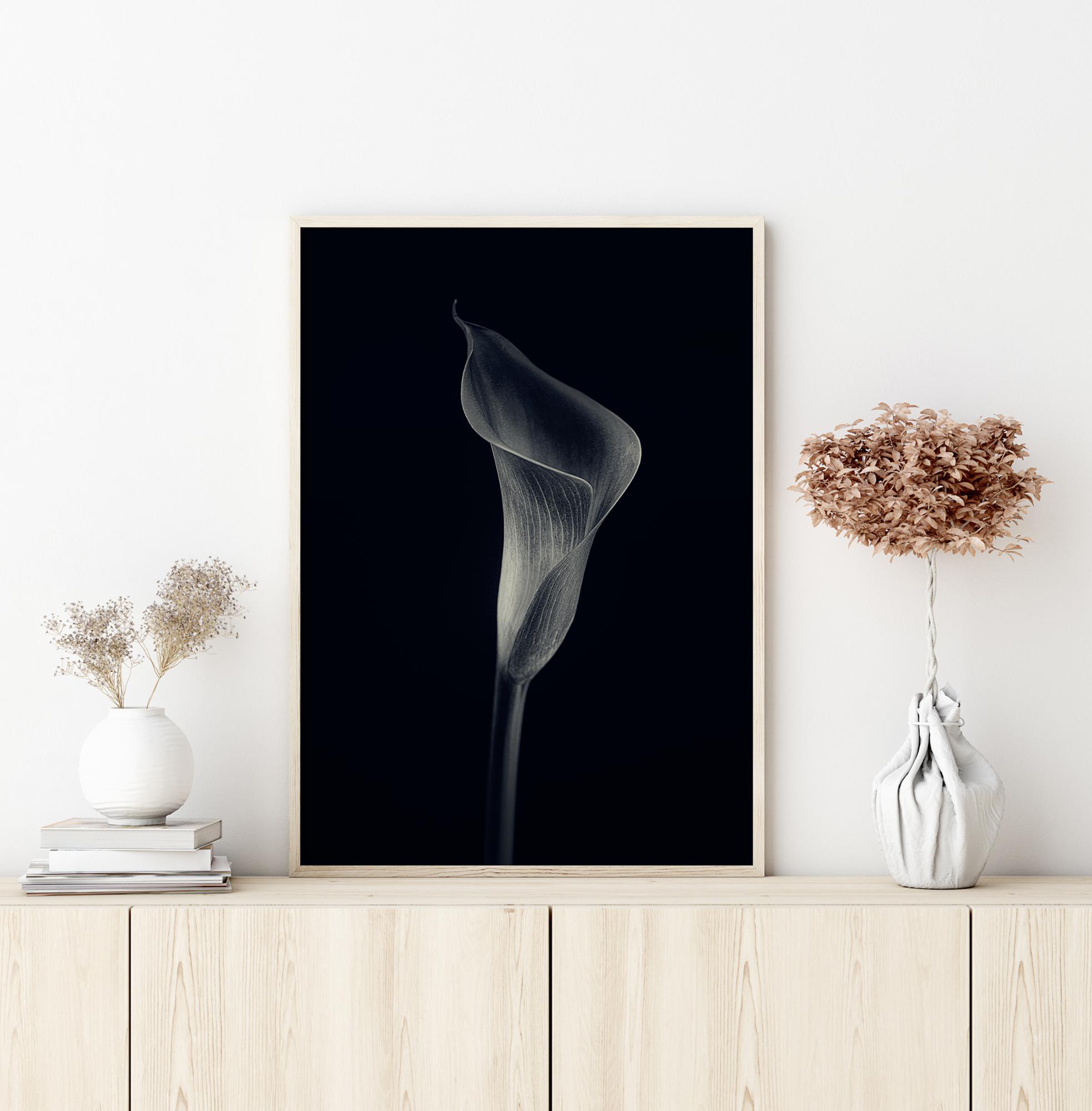 Ein einzelnes Calla-Lilien-Poster, das ein ätherisches Leuchten erzeugt. Ein umgekehrtes Negativ dieser Lilie verleiht der Blume eine mystische Qualität vor einem schwarzen Hintergrund. Dieses ungewöhnliche Foto einer Calla-Lilie wird garantiert für Gesprächsstoff sorgen, wenn Sie es für einen zusätzlichen dramatischen Effekt an eine weiße Wand hängen.